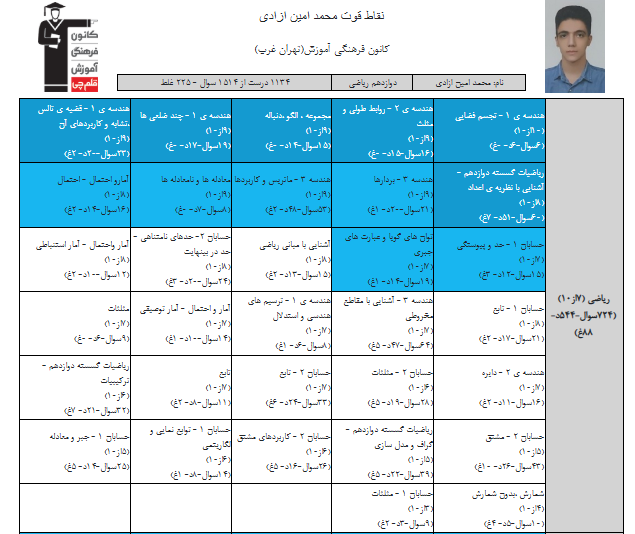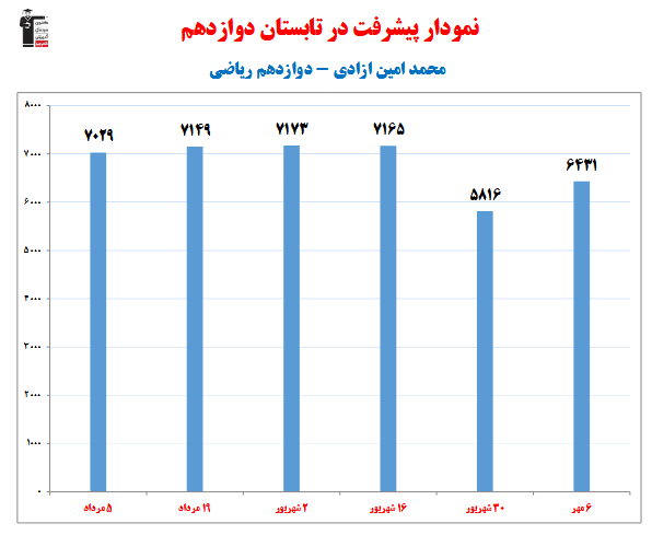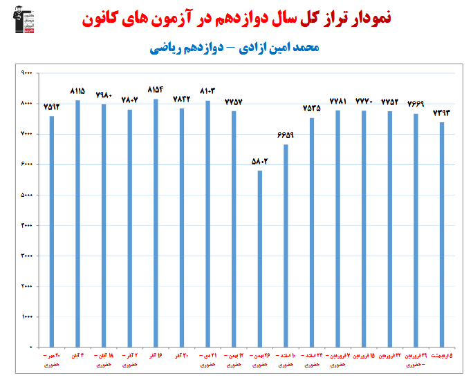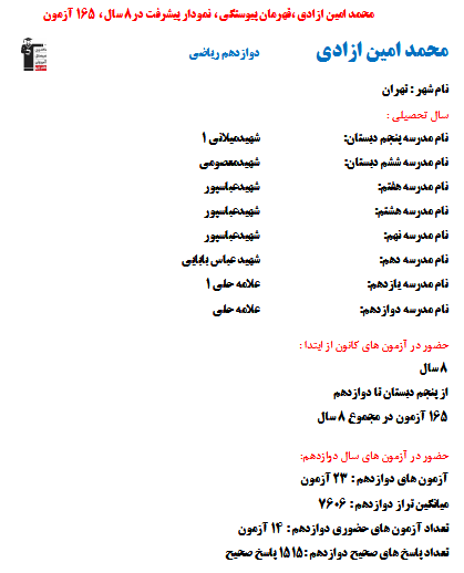 در ادامه میتوانید عملکرد درسی محمدامین ازادی را در کانون مشاهده کنید.نمودار پیشرفت میانگین تراز در پایههای مختلف، نمودار تراز کل، عملکرد آزمونهای سال دوازدهم و شروع از تابستان و تراز آزمون های تابستان، کارنامههای مبحثی در نمودارها و تصاویر زیر قابل مشاهده است.