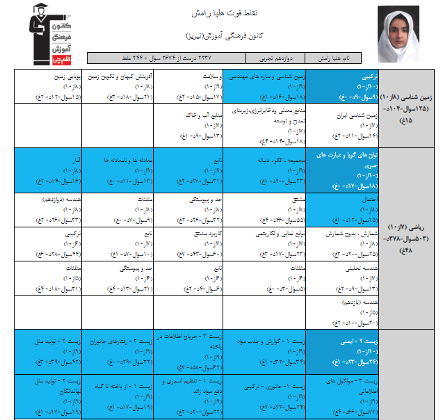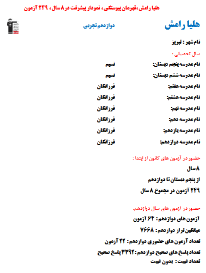 در ادامه میتوانید عملکرد درسی هلیا رامش را در کانون مشاهده کنید.نمودار پیشرفت میانگین تراز در پایههای مختلف، نمودار تراز کل، عملکرد آزمونهای سال دوازدهم و شروع از تابستان و تراز آزمون های تابستان، کارنامههای مبحثی در نمودارها و تصاویر زیر قابل مشاهده است.