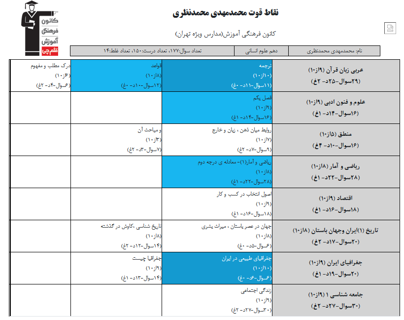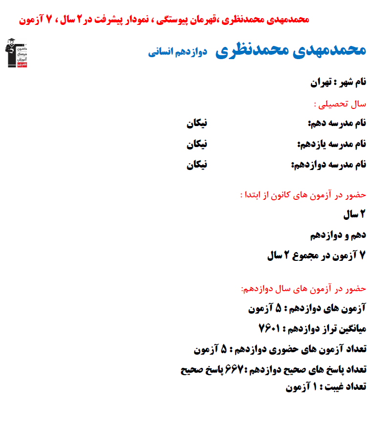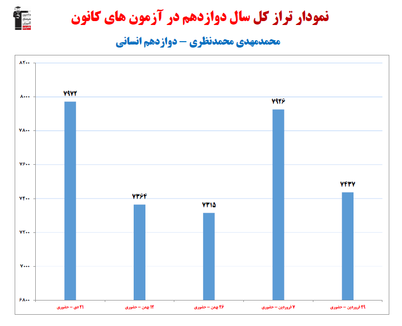 در ادامه میتوانید عملکرد درسی محمدمهدی محمدنظری را در کانون مشاهده کنید.نمودار پیشرفت میانگین تراز در پایههای مختلف، نمودار تراز کل، عملکرد آزمونهای سال دوازدهم، کارنامههای مبحثی در نمودارها و تصاویر زیر قابل مشاهده است.