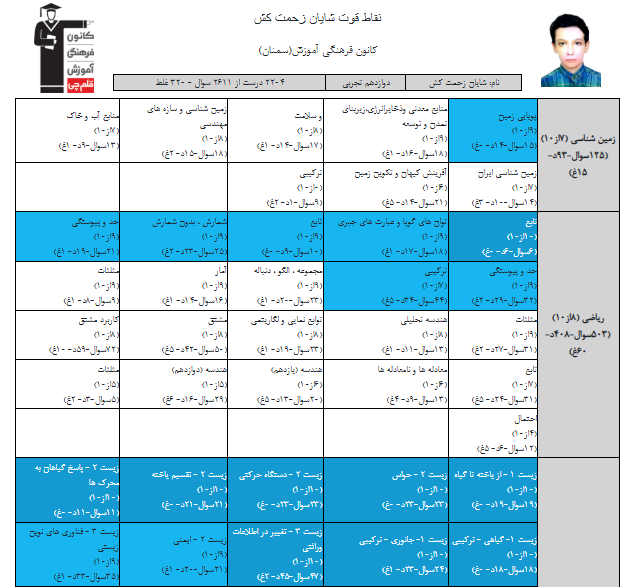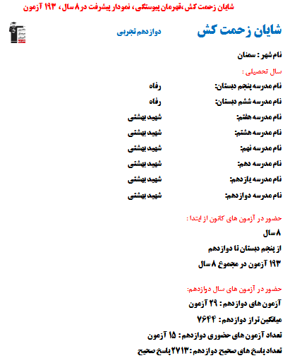 در ادامه میتوانید عملکرد درسی شایان زحمت کش را در کانون مشاهده کنید.نمودار پیشرفت میانگین تراز در پایههای مختلف، نمودار تراز کل، عملکرد آزمونهای سال دوازدهم ، کارنامههای مبحثی در نمودارها و تصاویر زیر قابل مشاهده است.