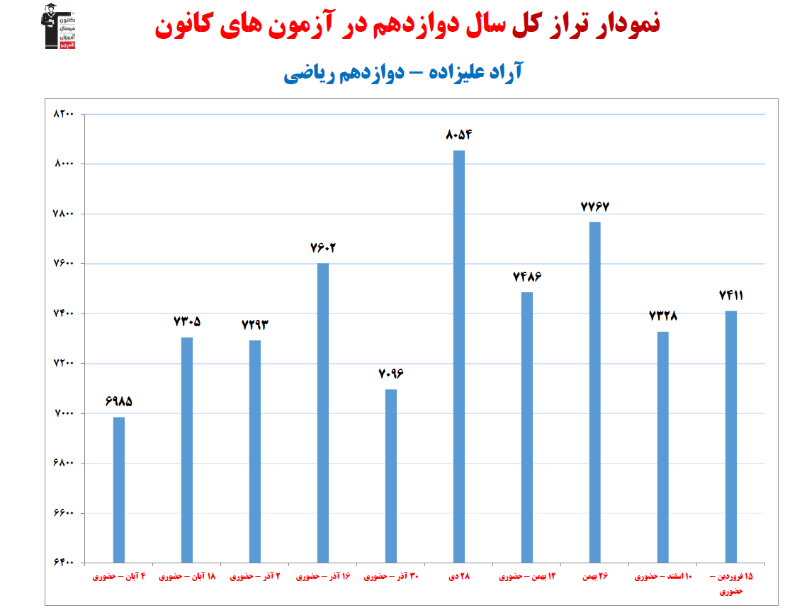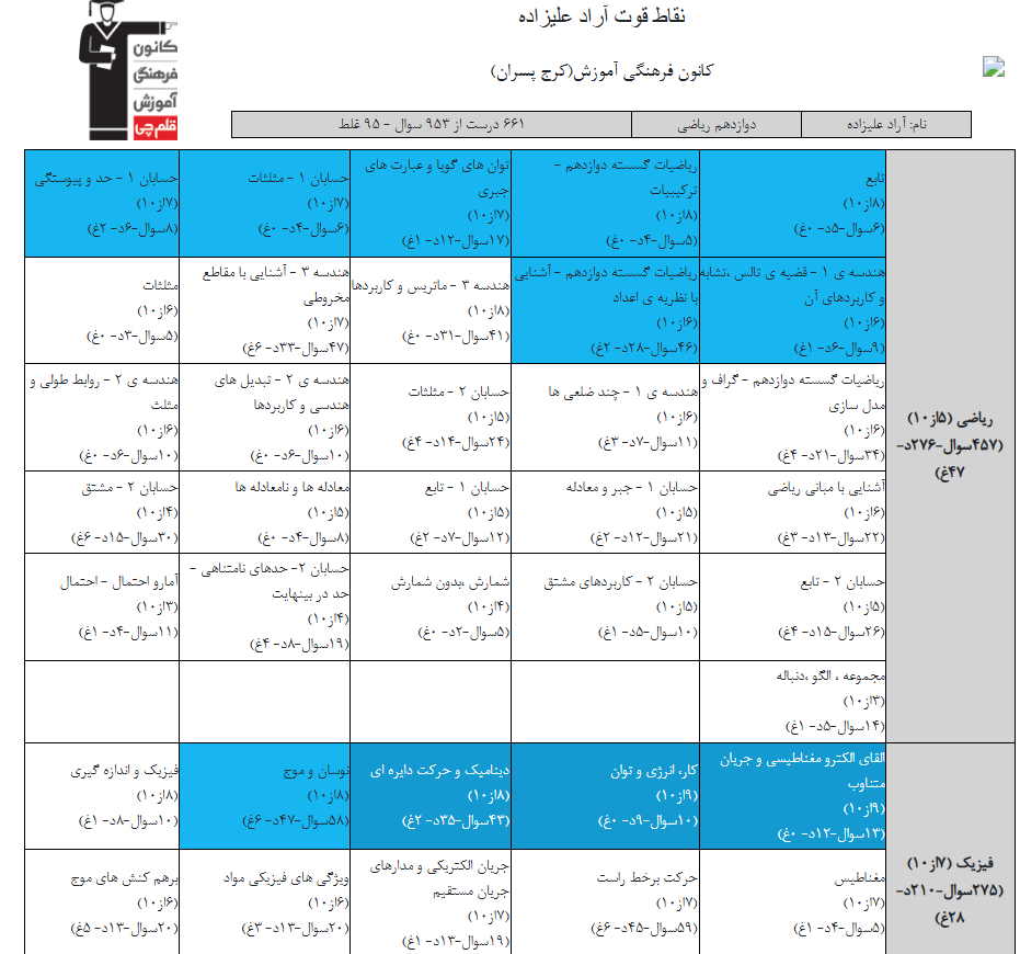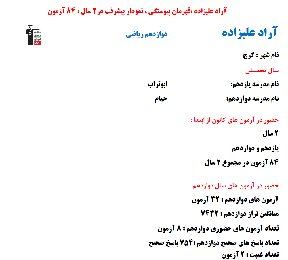 در ادامه میتوانید عملکرد درسی آراد علیزاده را در کانون مشاهده کنید.نمودار پیشرفت میانگین تراز در پایههای مختلف، نمودار تراز کل، عملکرد آزمونهای سال دوازدهم ، کارنامههای مبحثی در نمودارها و تصاویر زیر قابل مشاهده است.