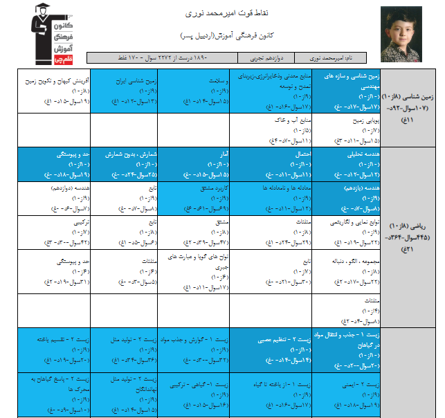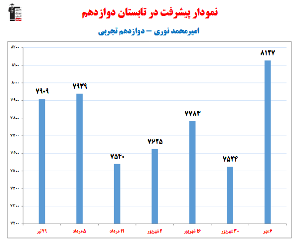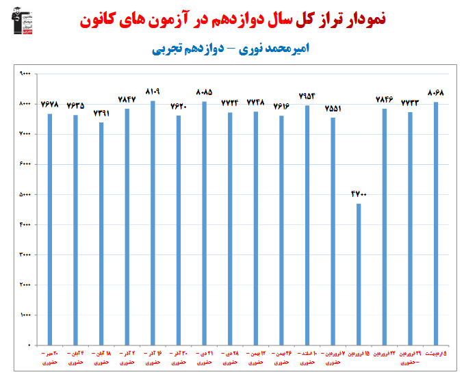 در ادامه میتوانید عملکرد درسی امیرمحمد نوری را در کانون مشاهده کنید.نمودار پیشرفت میانگین تراز در پایههای مختلف، نمودار تراز کل، عملکرد آزمونهای سال دوازدهم و شروع از تابستان و تراز آزمون های تابستان، کارنامههای مبحثی در نمودارها و تصاویر زیر قابل مشاهده است.