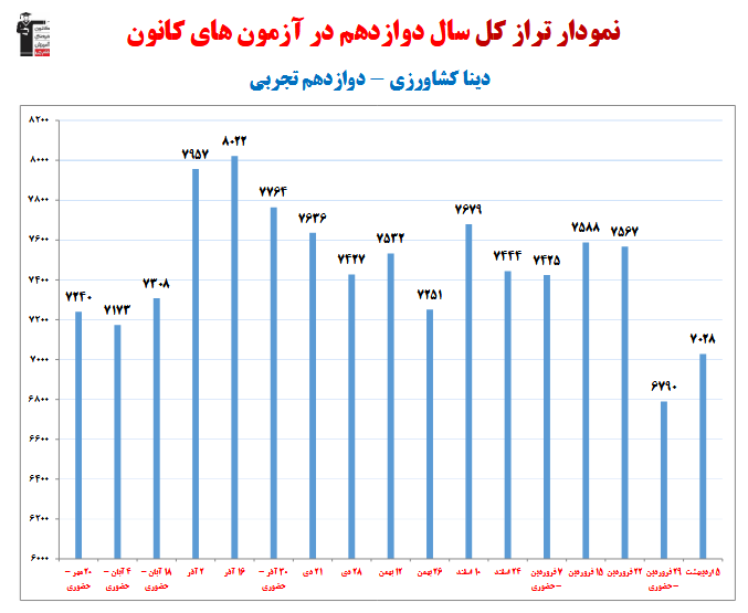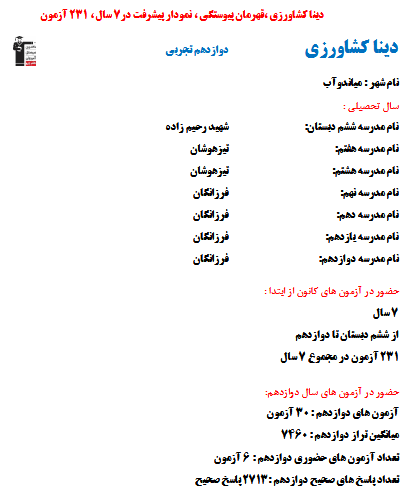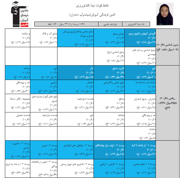 در ادامه میتوانید عملکرد درسی دینا کشاورزی را در کانون مشاهده کنید.نمودار پیشرفت میانگین تراز در پایههای مختلف، نمودار تراز کل، عملکرد آزمونهای سال دوازدهم و شروع از تابستان و تراز آزمون های تابستان، کارنامههای مبحثی در نمودارها و تصاویر زیر قابل مشاهده است.