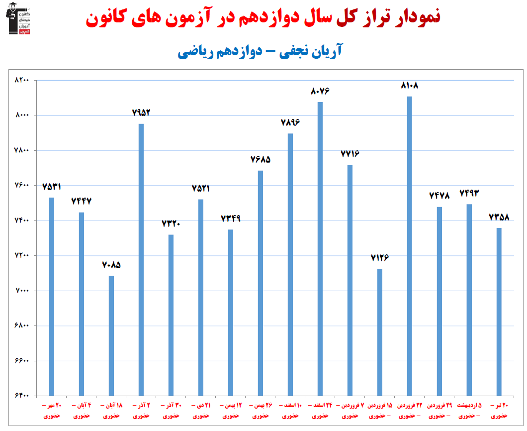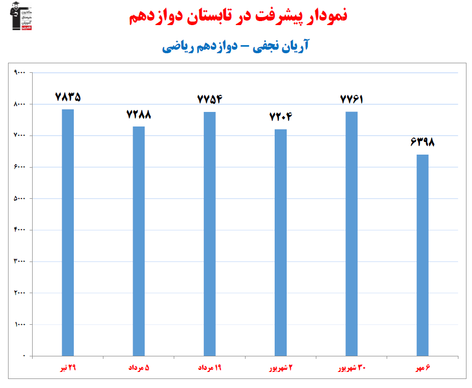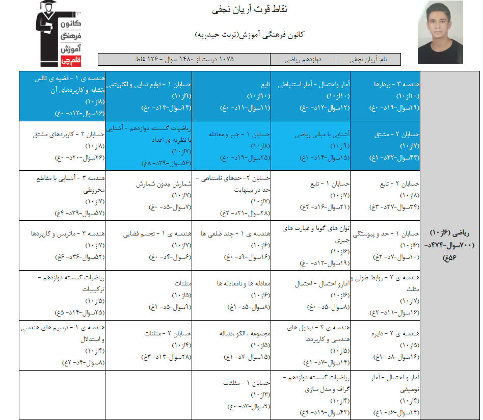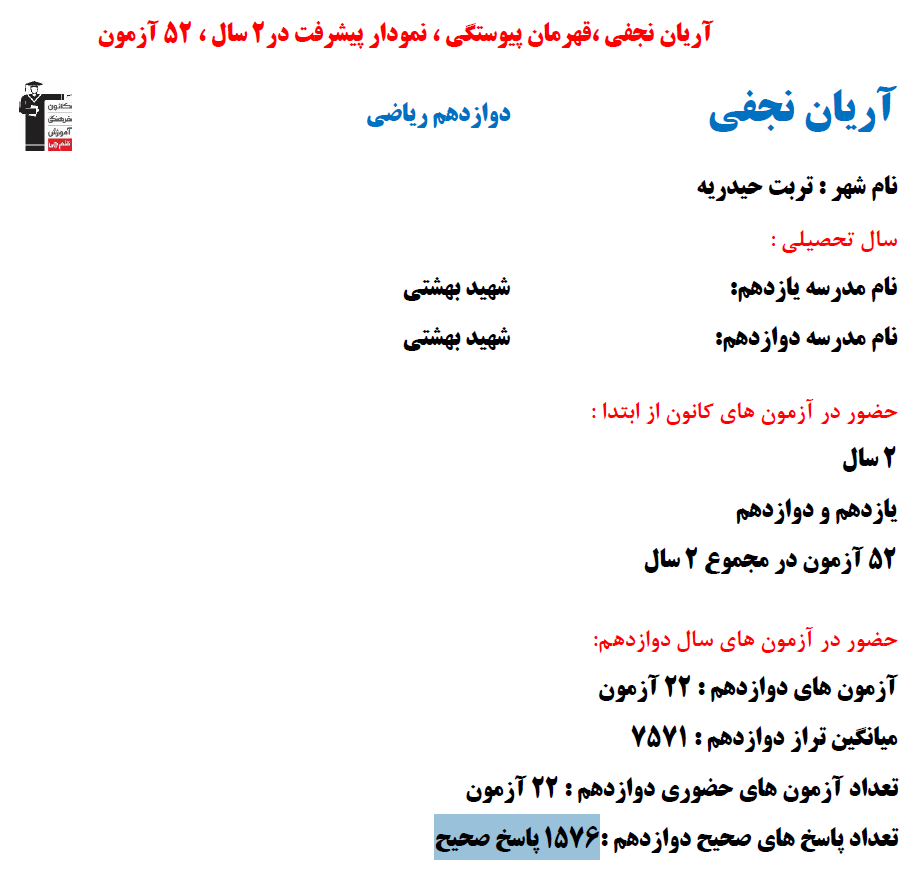 در ادامه میتوانید عملکرد درسی اریان نجفی را در کانون مشاهده کنید.نمودار پیشرفت میانگین تراز در پایههای مختلف، نمودار تراز کل، عملکرد آزمونهای سال دوازدهم و شروع از تابستان و تراز آزمون های تابستان، کارنامههای مبحثی در نمودارها و تصاویر زیر قابل مشاهده است.