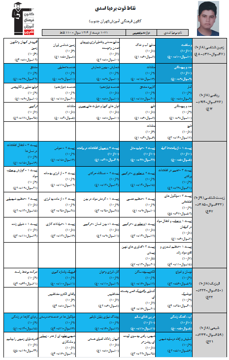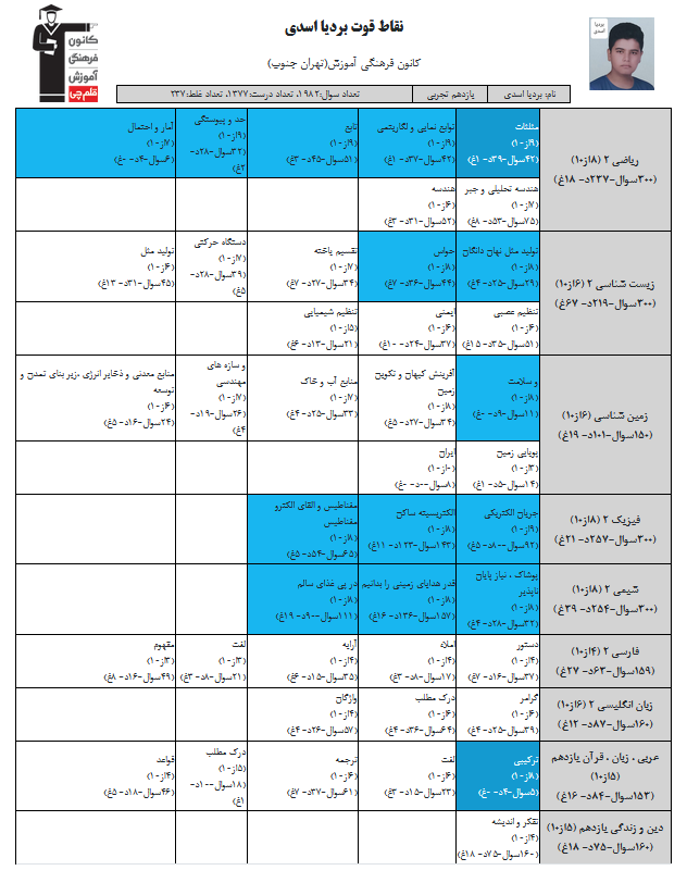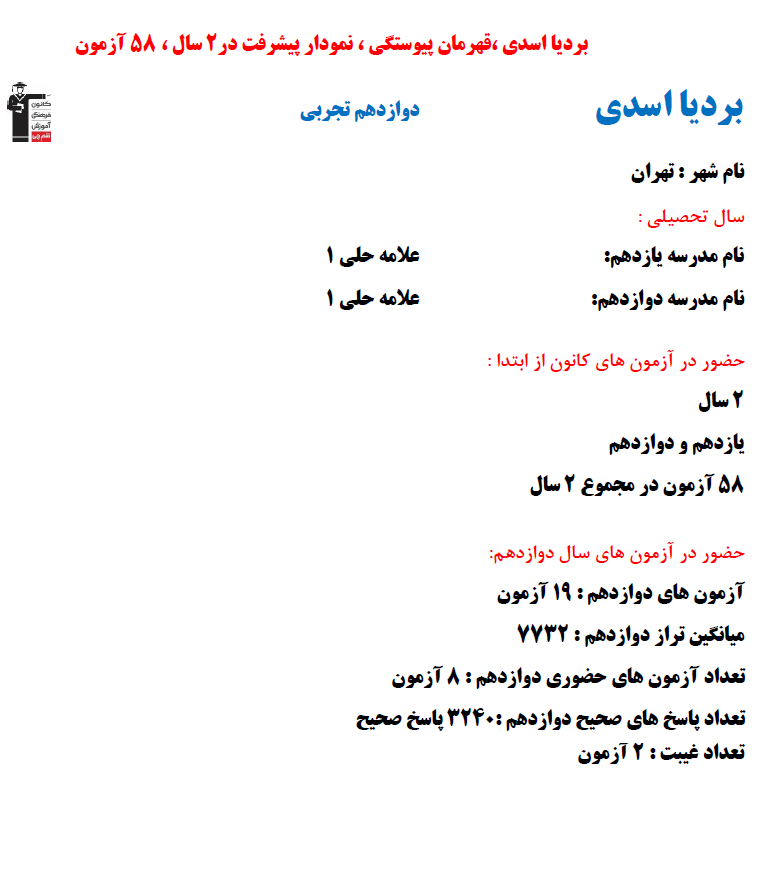 در ادامه میتوانید عملکرد درسی بردیا اسدی را در کانون مشاهده کنید.نمودار پیشرفت میانگین تراز در پایههای مختلف، نمودار تراز کل، عملکرد آزمونهای سال دوازدهم و شروع از تابستان و تراز آزمون های تابستان، کارنامههای مبحثی در نمودارها و تصاویر زیر قابل مشاهده است.