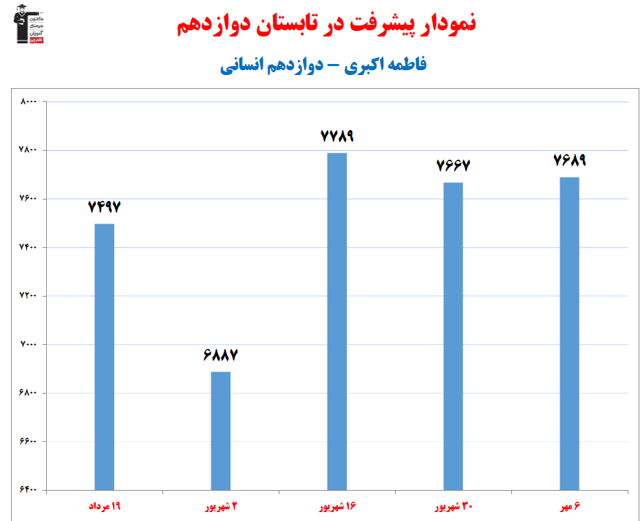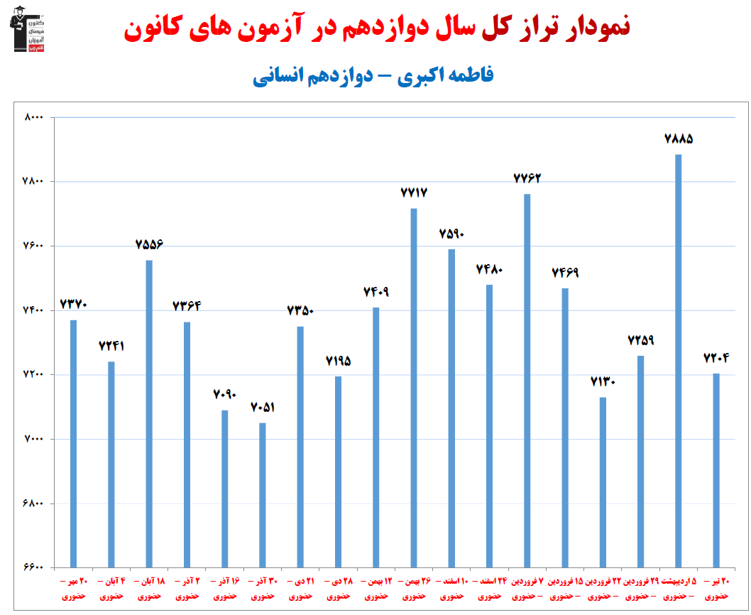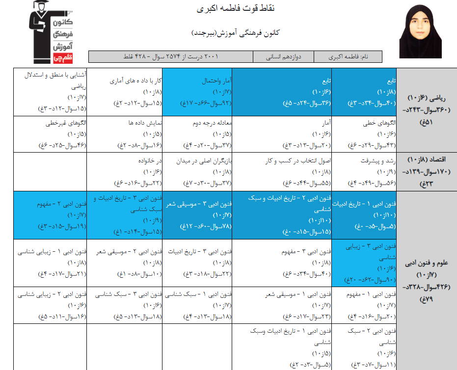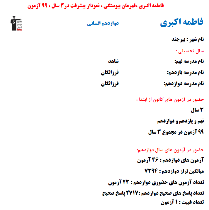 در ادامه میتوانید عملکرد درسی فاطمه اکبری را در کانون مشاهده کنید.نمودار پیشرفت میانگین تراز در پایههای مختلف، نمودار تراز کل، عملکرد آزمونهای سال دوازدهم و شروع از تابستان و تراز آزمون های تابستان، کارنامههای مبحثی در نمودارها و تصاویر زیر قابل مشاهده است.