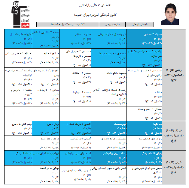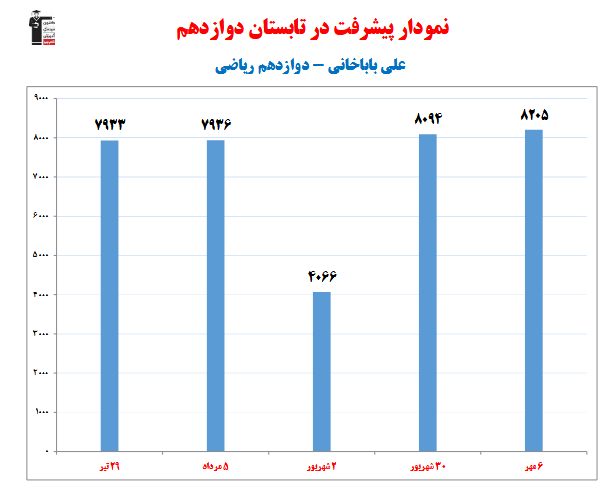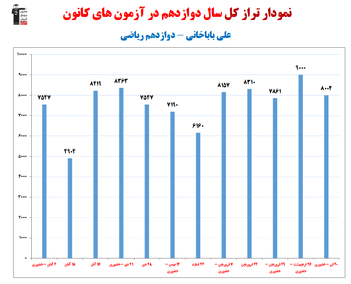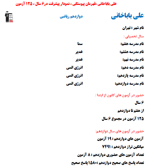 در ادامه میتوانید عملکرد درسی علی باباخانی را در کانون مشاهده کنید. نمودار پیشرفت میانگین تراز در پایههای مختلف، نمودار تراز کل، عملکرد آزمونهای سال دوازدهم و شروع از تابستان و تراز آزمون های تابستان، کارنامههای مبحثی در نمودارها و تصاویر زیر قابل مشاهده است.