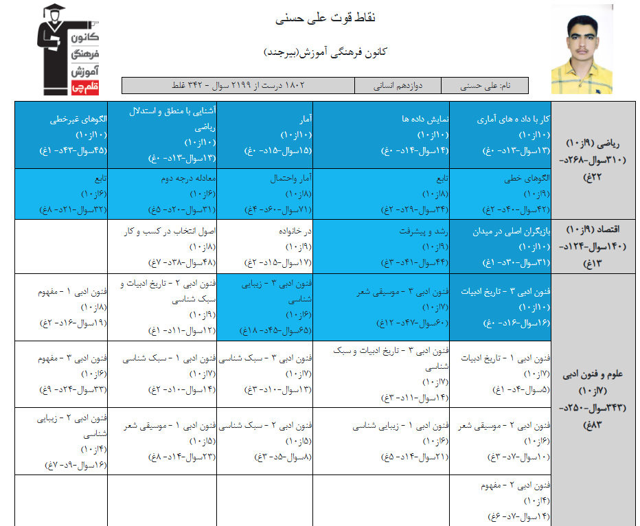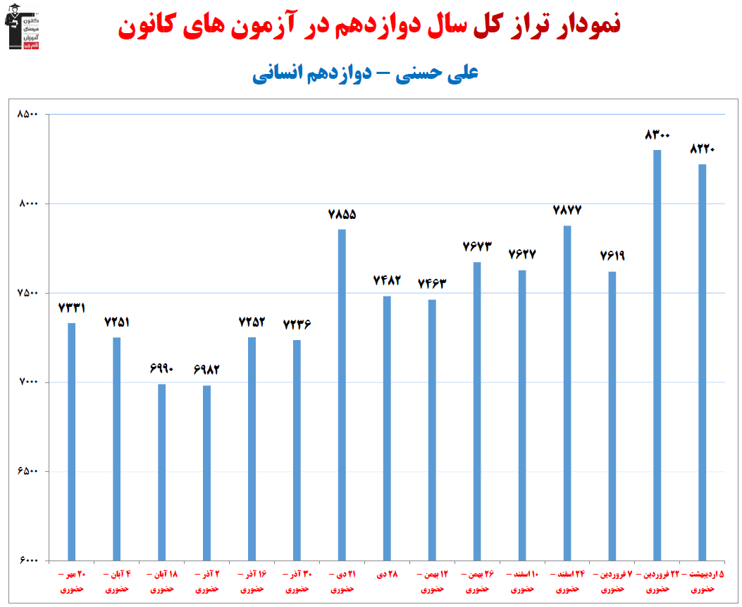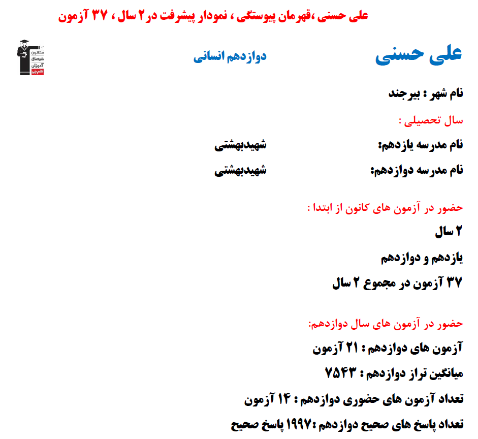 در ادامه میتوانید عملکرد درسی علی حسنی را در کانون مشاهده کنید.نمودار پیشرفت میانگین تراز در پایههای مختلف، نمودار تراز کل، عملکرد آزمونهای سال دوازدهم و شروع از تابستان و تراز آزمون های تابستان، کارنامههای مبحثی در نمودارها و تصاویر زیر قابل مشاهده است.