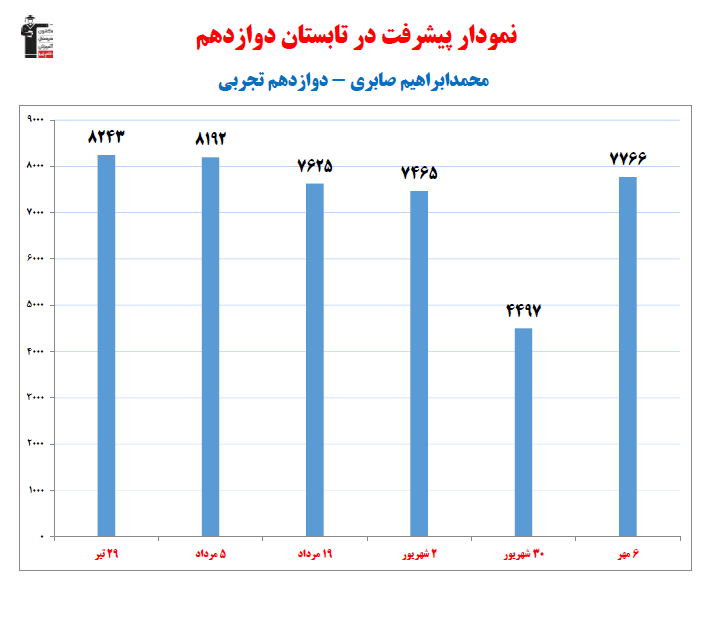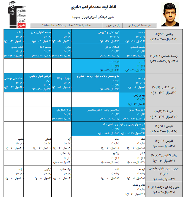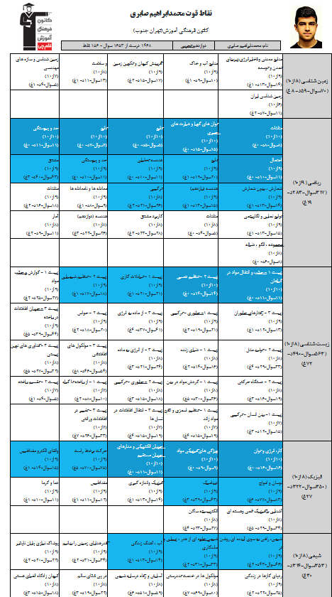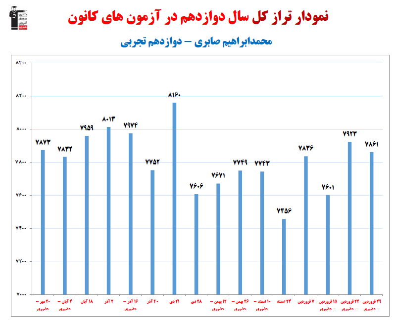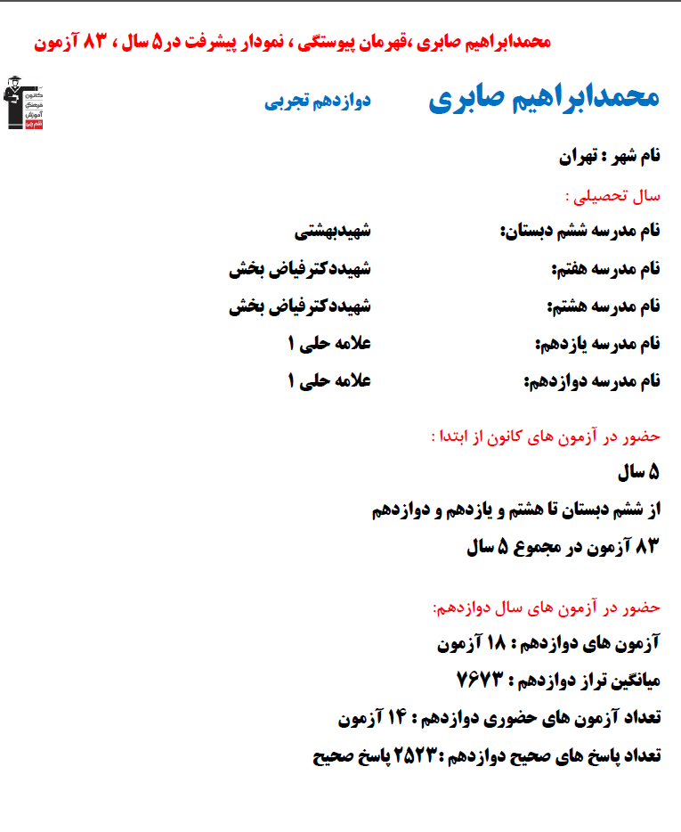 در ادامه میتوانید عملکرد درسی محمدابراهیم صابری را در کانون مشاهده کنید.نمودار پیشرفت میانگین تراز در پایههای مختلف، نمودار تراز کل، عملکرد آزمونهای سال دوازدهم و شروع از تابستان و تراز آزمون های تابستان، کارنامههای مبحثی در نمودارها و تصاویر زیر قابل مشاهده است.