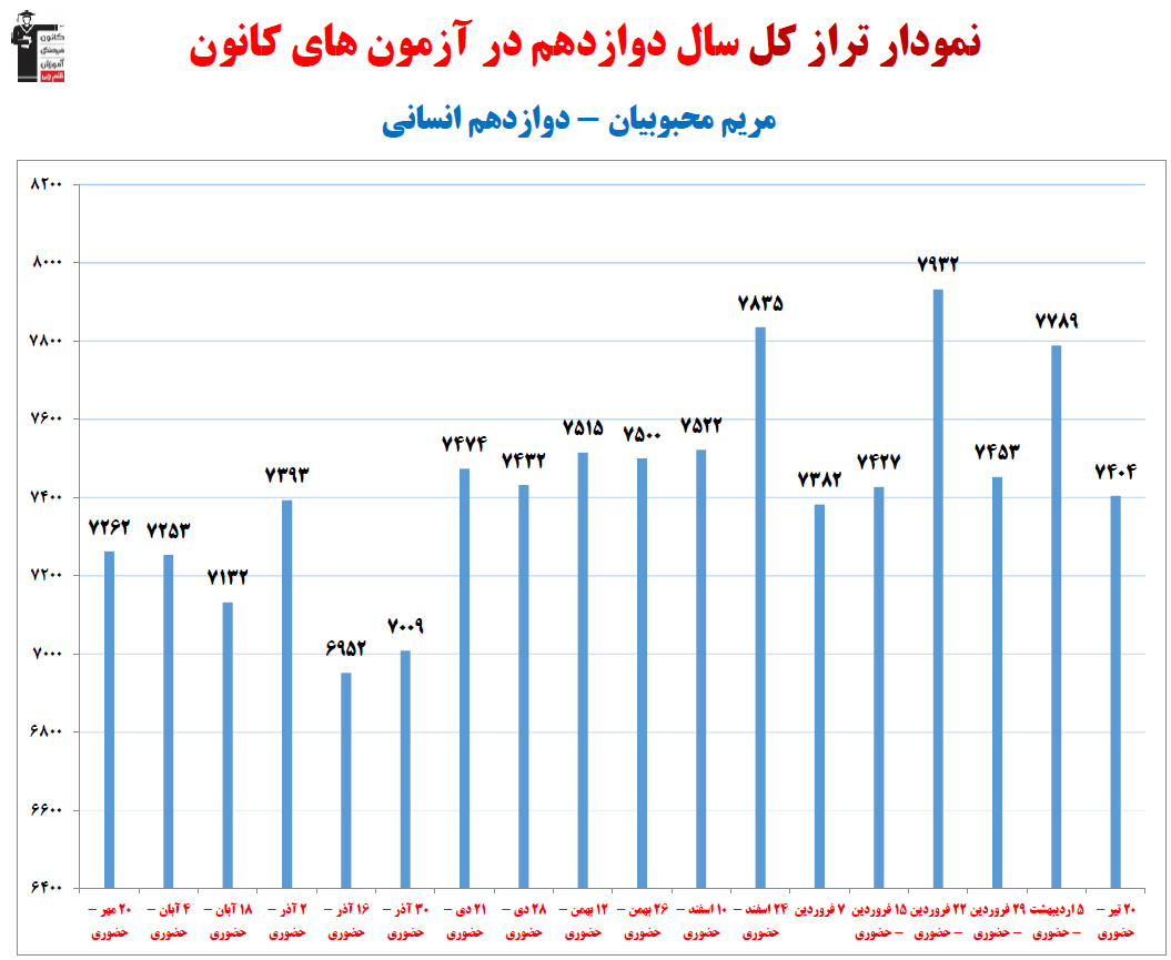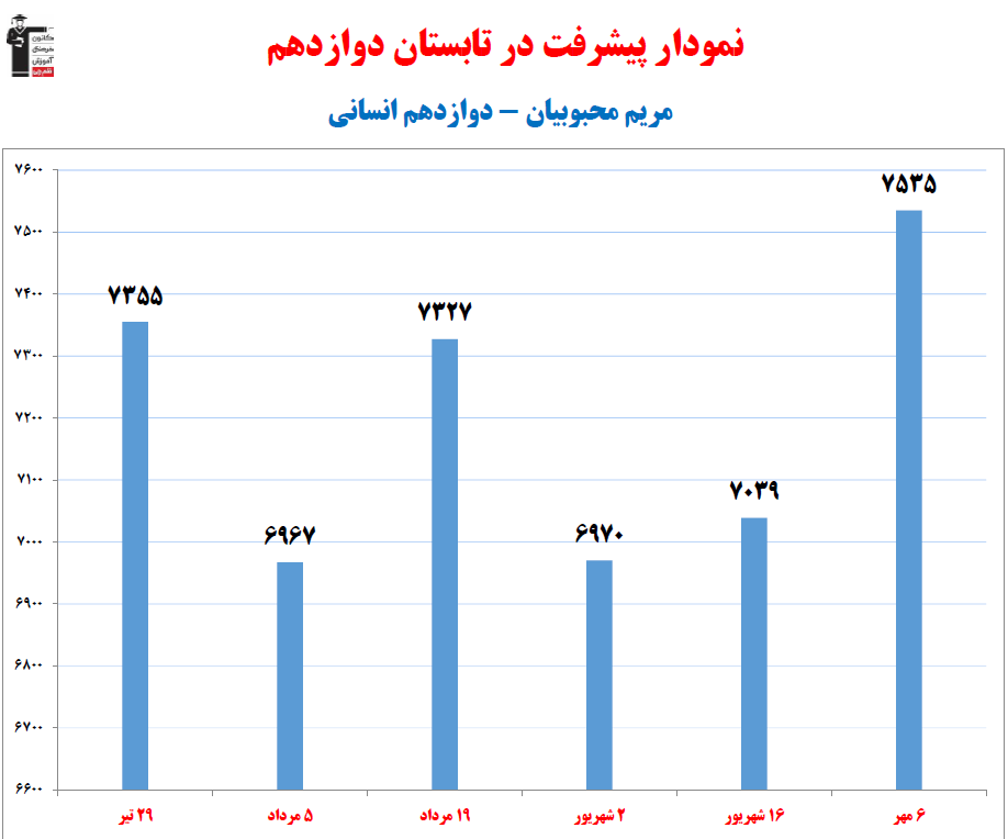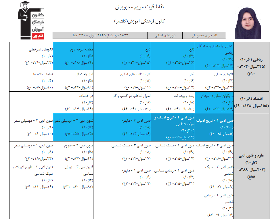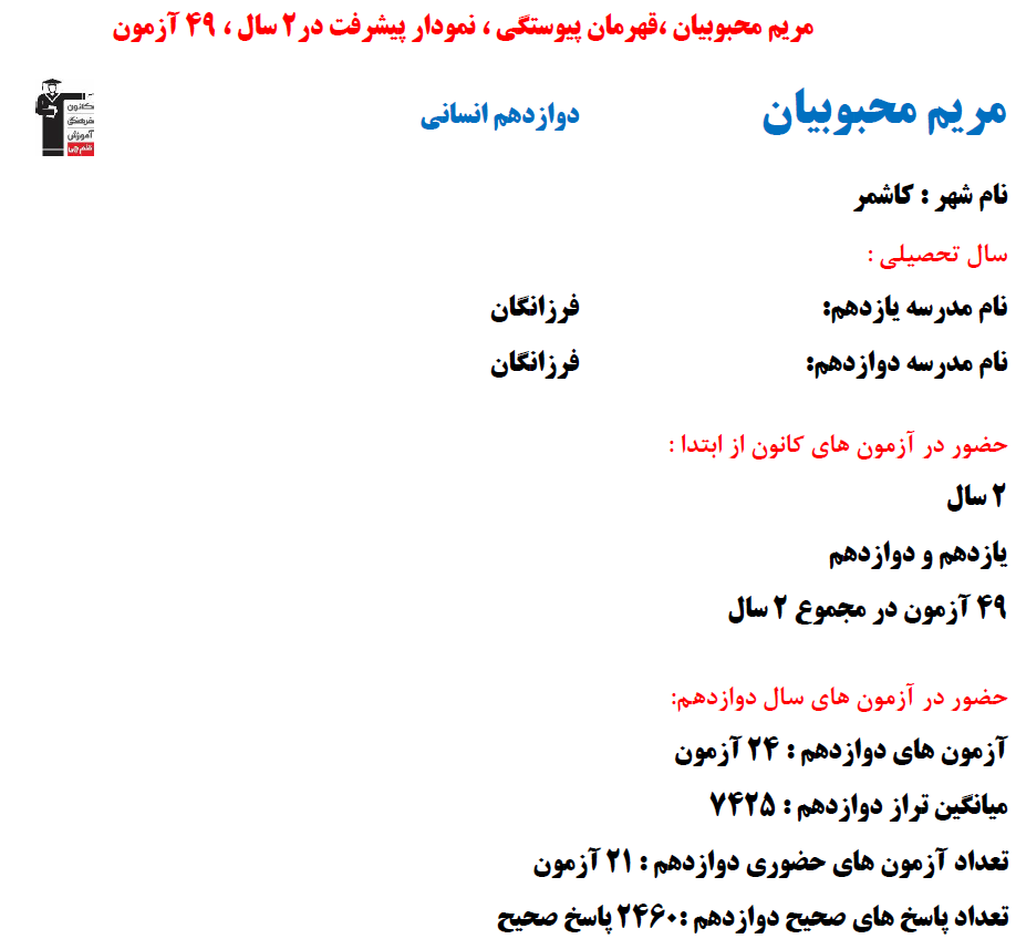 در ادامه میتوانید عملکرد درسی مریم محبوبیان را در کانون مشاهده کنید.نمودار پیشرفت میانگین تراز در پایههای مختلف، نمودار تراز کل، عملکرد آزمونهای سال دوازدهم و شروع از تابستان و تراز آزمون های تابستان، کارنامههای مبحثی در نمودارها و تصاویر زیر قابل مشاهده است.