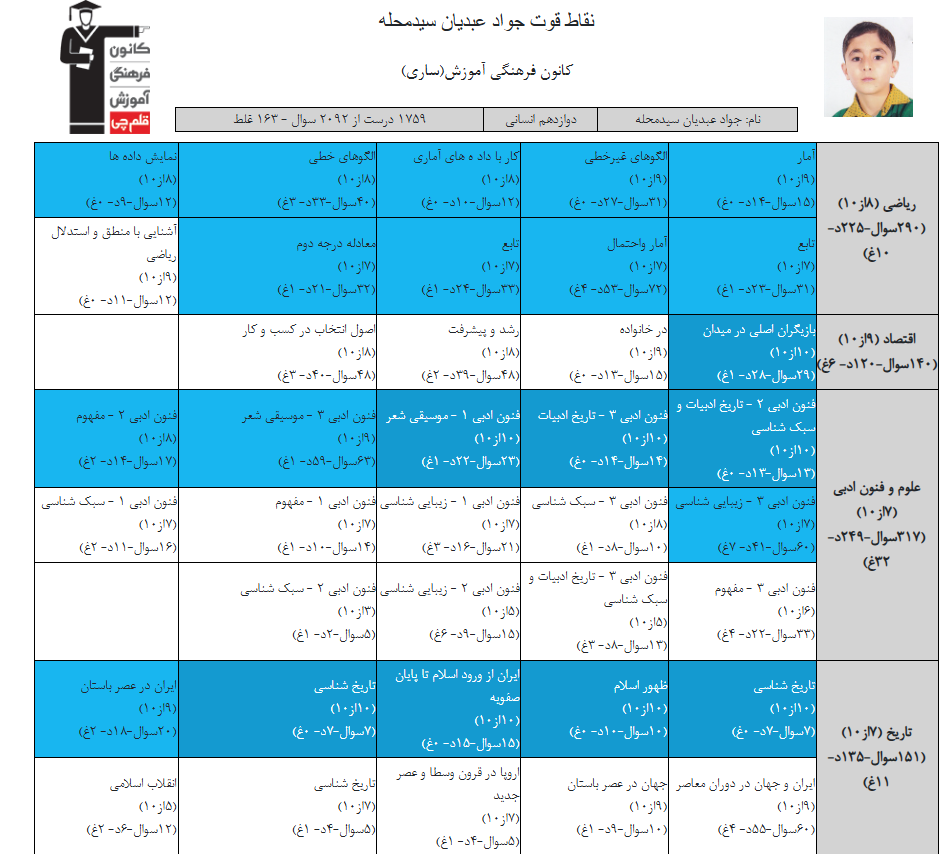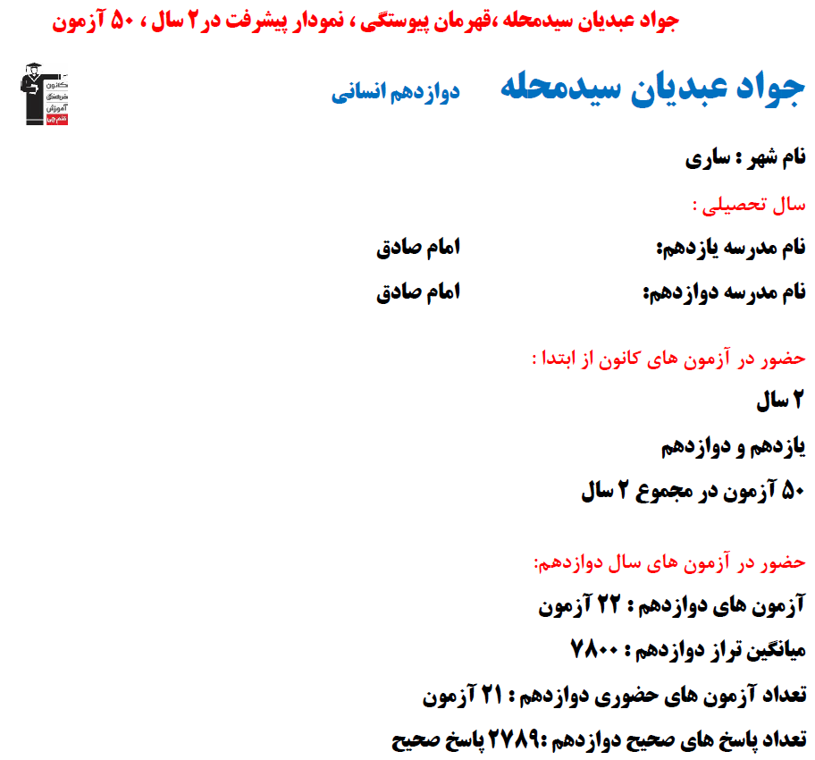 در ادامه میتوانید عملکرد درسی جواد عبدیان را در کانون مشاهده کنید.نمودار پیشرفت میانگین تراز در پایههای مختلف، نمودار تراز کل، عملکرد آزمونهای سال دوازدهم و شروع از تابستان و تراز آزمون های تابستان، کارنامههای مبحثی در نمودارها و تصاویر زیر قابل مشاهده است.
