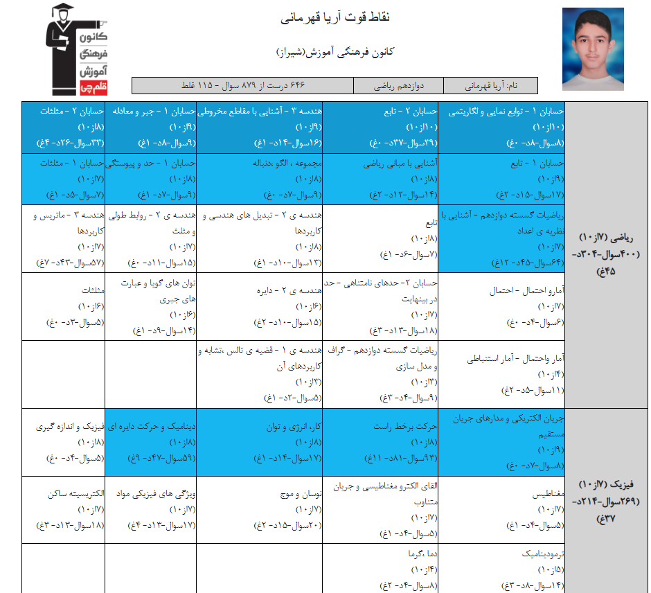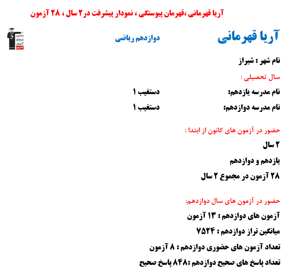 در ادامه میتوانید عملکرد درسی اریا قهرمانی را در کانون مشاهده کنید.