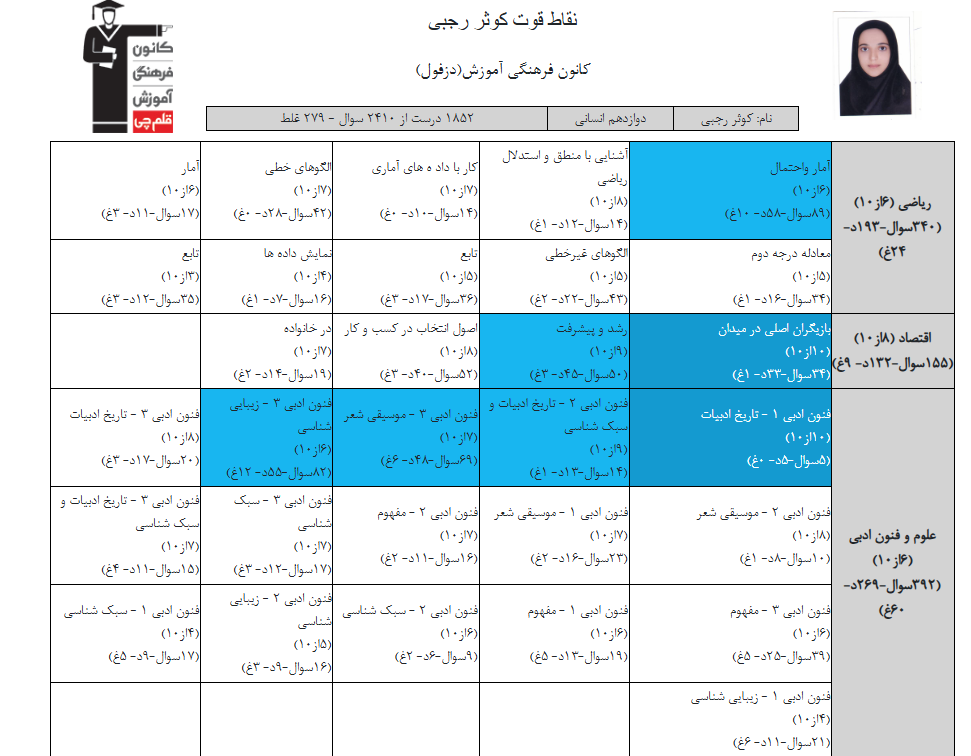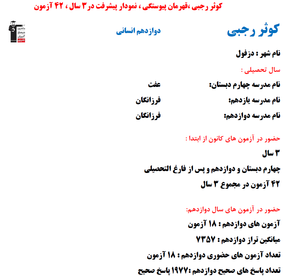در ادامه میتوانید عملکرد درسی کوثر رجبي را در کانون مشاهده کنید.نمودار پیشرفت میانگین تراز در پایههای مختلف، نمودار تراز کل، عملکرد آزمونهای سال دوازدهم ، کارنامههای مبحثی در نمودارها و تصاویر زیر قابل مشاهده است.