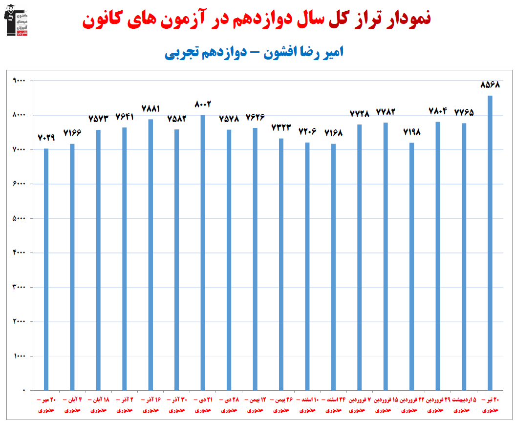 در ادامه میتوانید عملکرد درسی امير رضا افشون را در کانون مشاهده کنید.نمودار پیشرفت میانگین تراز در پایههای مختلف، نمودار تراز کل، عملکرد آزمونهای سال دوازدهم و شروع از تابستان و تراز آزمون های تابستان، کارنامههای مبحثی در نمودارها و تصاویر زیر قابل مشاهده است.