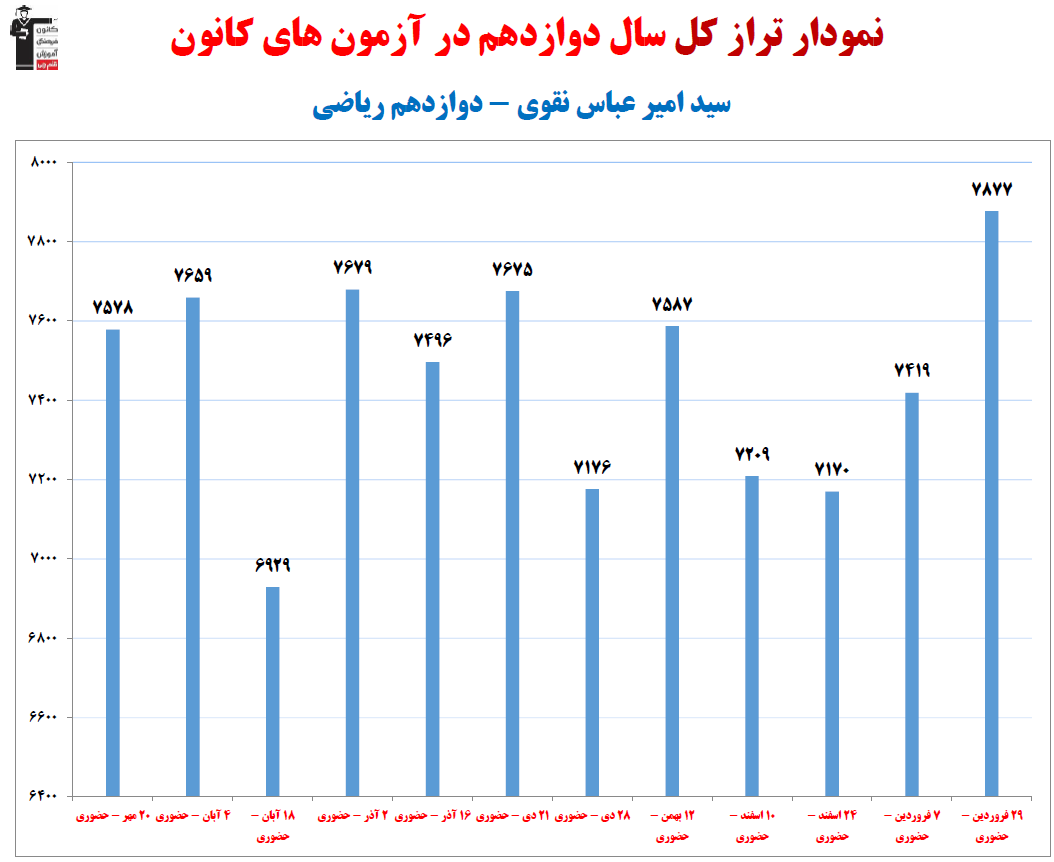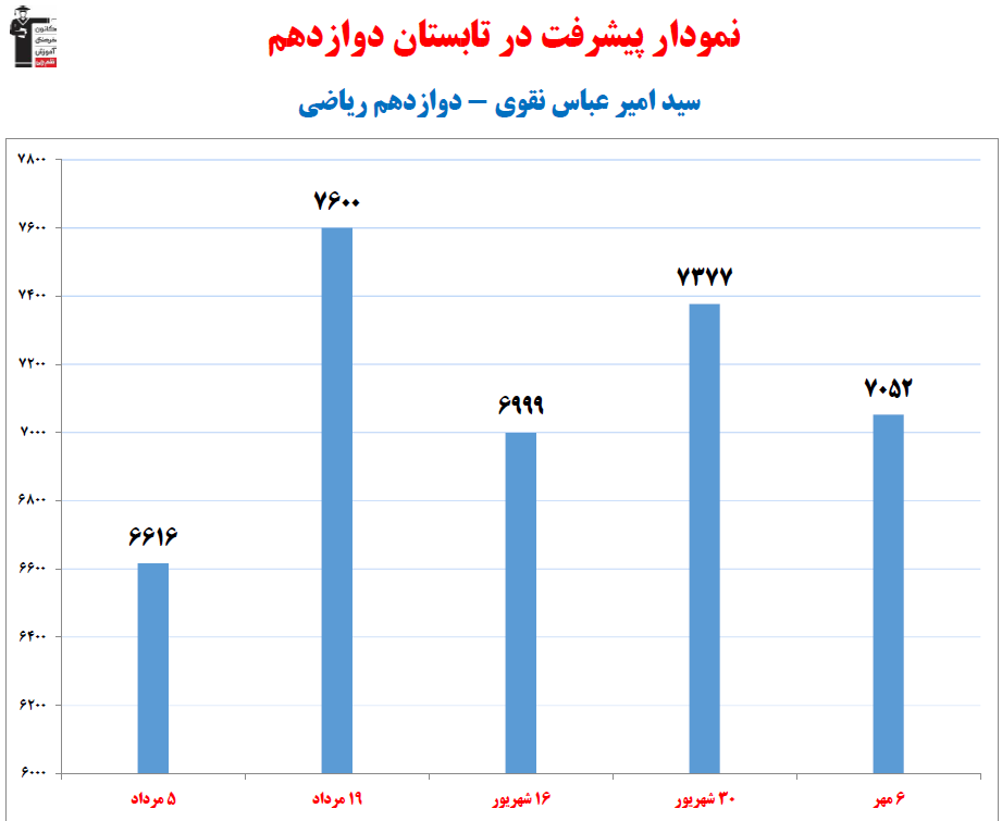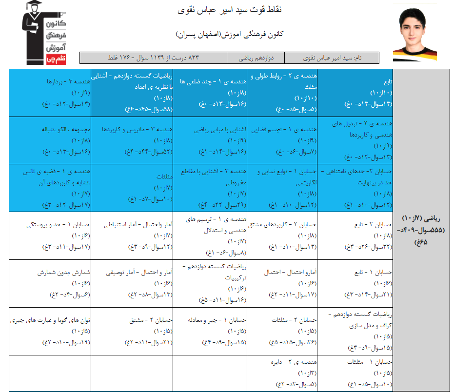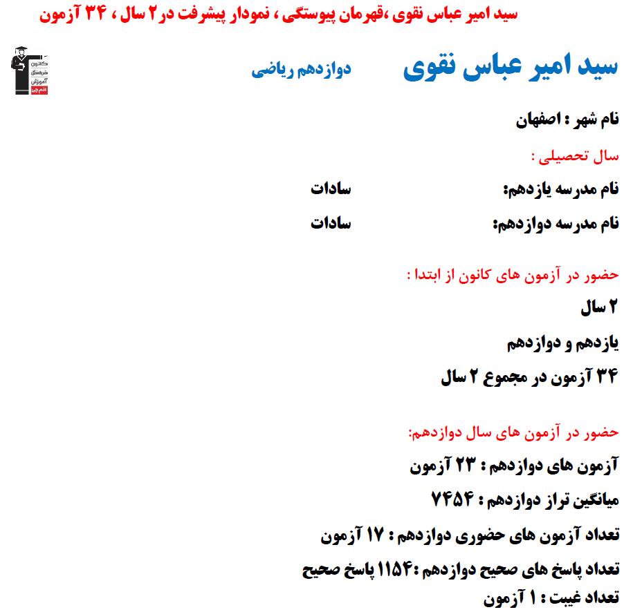 در ادامه میتوانید عملکرد درسی امير عباس نقوي را در کانون مشاهده کنید.نمودار پیشرفت میانگین تراز در پایههای مختلف، نمودار تراز کل، عملکرد آزمونهای سال دوازدهم و شروع از تابستان و تراز آزمون های تابستان، کارنامههای مبحثی در نمودارها و تصاویر زیر قابل مشاهده است.