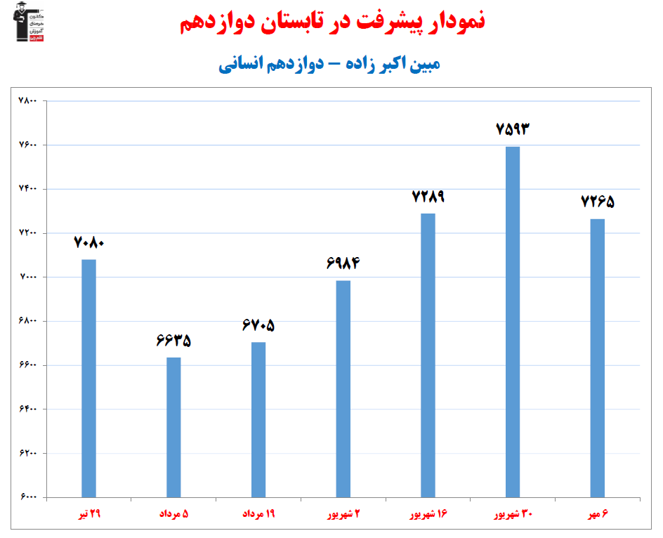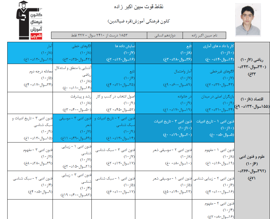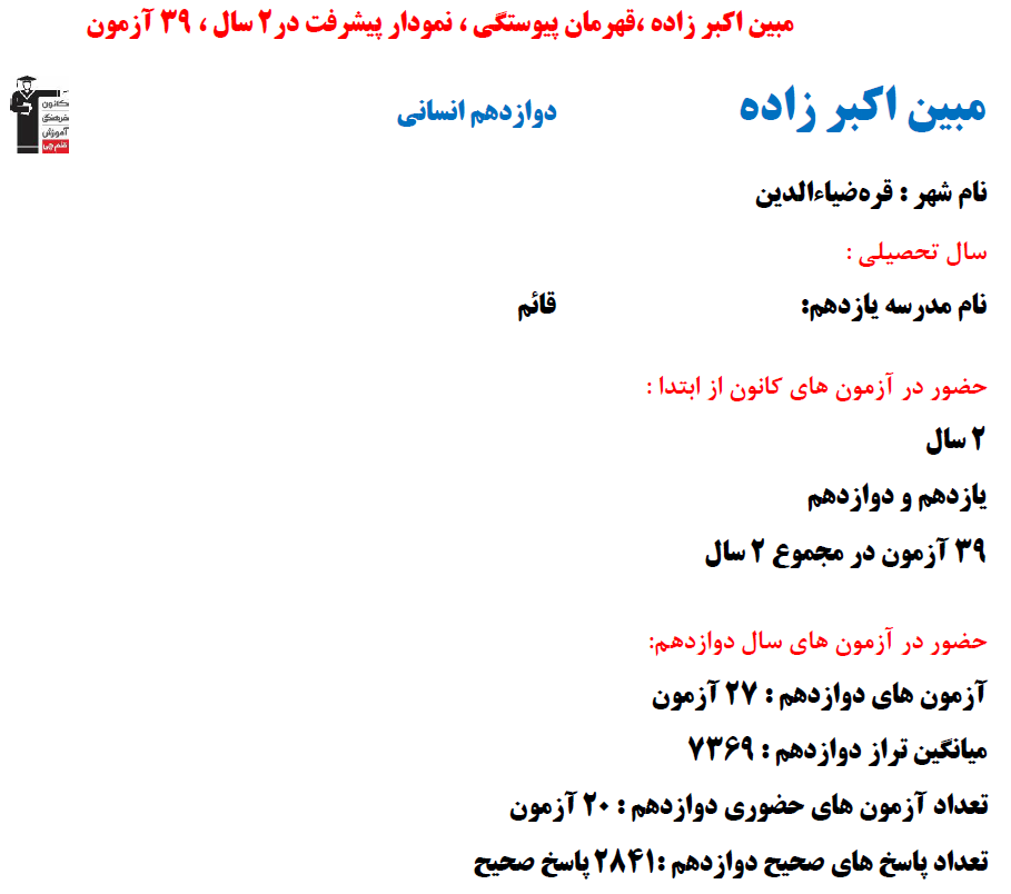در ادامه میتوانید عملکرد درسی مبين اکبر زاده را در کانون مشاهده کنید.نمودار پیشرفت میانگین تراز در پایههای مختلف، نمودار تراز کل، عملکرد آزمونهای سال دوازدهم و شروع از تابستان و تراز آزمون های تابستان، کارنامههای مبحثی در نمودارها و تصاویر زیر قابل مشاهده است.