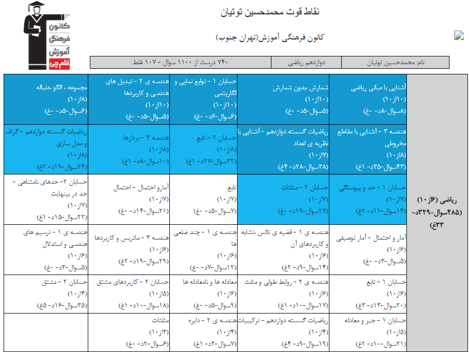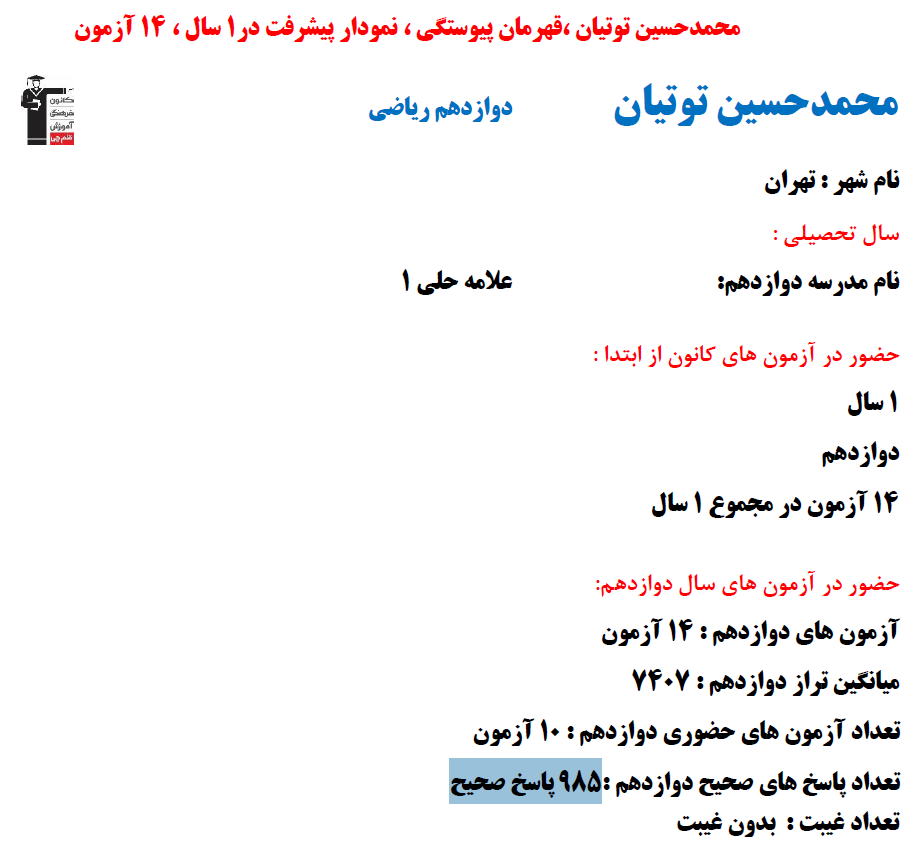 در ادامه میتوانید عملکرد درسی محمدحسين توتيان را در کانون مشاهده کنید.نمودار پیشرفت میانگین تراز در پایههای مختلف، نمودار تراز کل، عملکرد آزمونهای سال دوازدهم ، کارنامههای مبحثی در نمودارها و تصاویر زیر قابل مشاهده است.