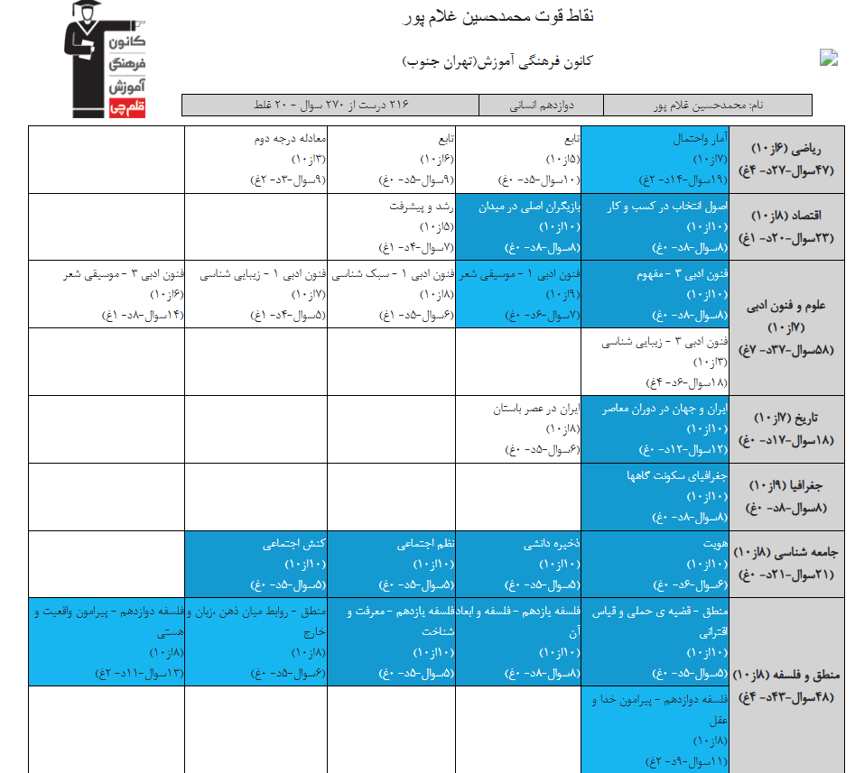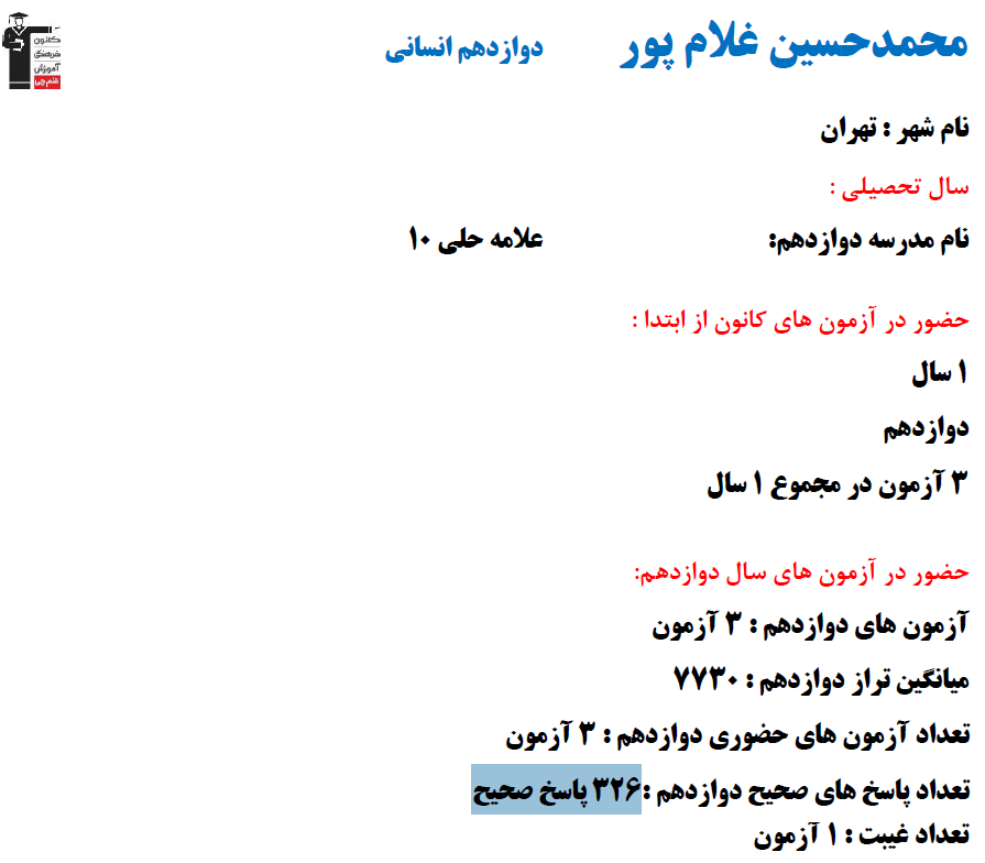 در ادامه میتوانید عملکرد درسی محمدحسين غلام پور را در کانون مشاهده کنید.نمودار پیشرفت میانگین تراز در پایههای مختلف، نمودار تراز کل، عملکرد آزمونهای سال دوازدهم ، کارنامههای مبحثی در نمودارها و تصاویر زیر قابل مشاهده است.