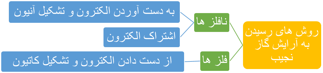 🔸رفتار شیمیایی هر اتم به شمار الكترون های ظرفیت آن بستگی دارد به طوری كه می توان دستیابی به آرایش گاز نجیب را مبنای رفتار آنها دانست. در واقع اتم ها می توانند با دادن الكترون، گرفتن الكترون و نیز به اشتراك گذاشتن آن به آرایش یك گاز نجیب برسند یا هشت تایی شوند تا پایدارتر گردند.