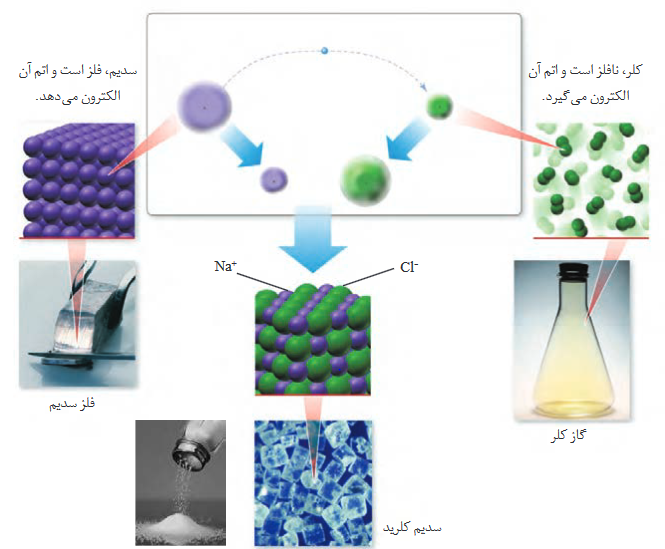 - 🔵اتم سدیم با از دست دادن الکترون کوچک تر و اتم کلر با گرفتن الکترون بزرگتر می شود.