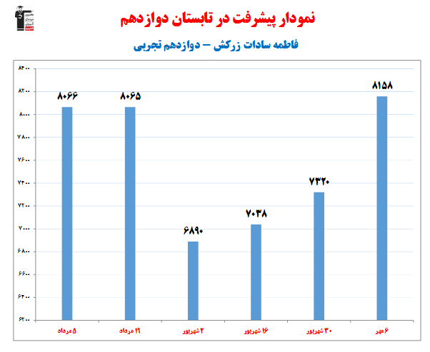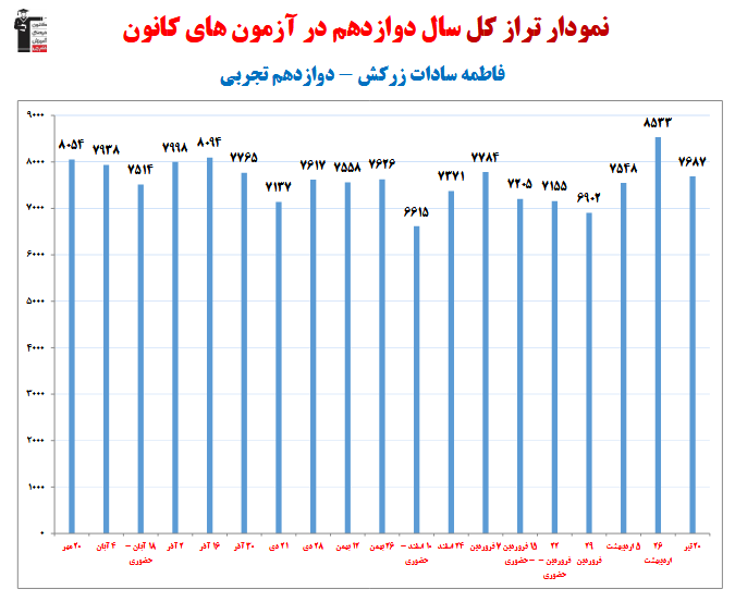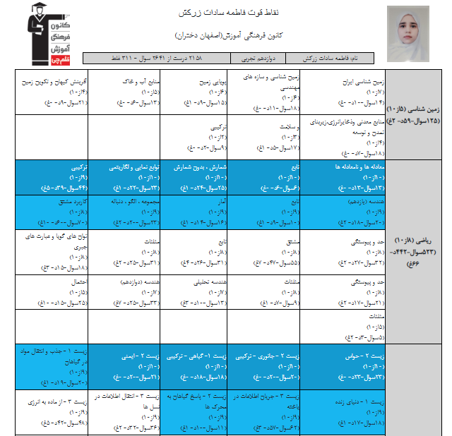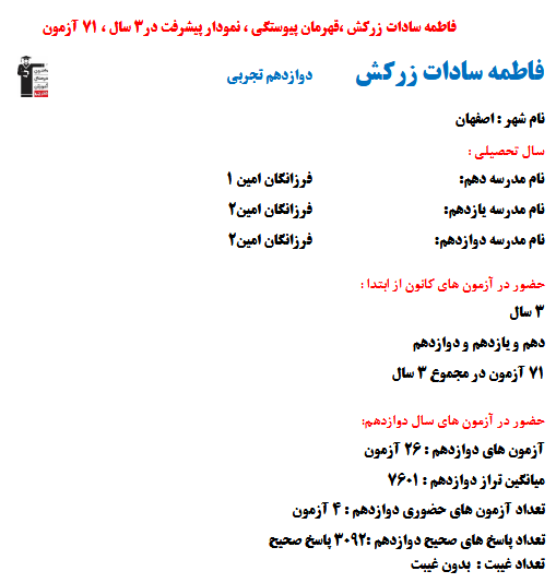 در ادامه میتوانید عملکرد درسی فاطمه سادات زرکش را در کانون مشاهده کنید. نمودار پیشرفت میانگین تراز در پایههای مختلف، نمودار تراز کل، عملکرد آزمونهای سال دوازدهم و شروع از تابستان و تراز آزمون های تابستان، کارنامههای مبحثی در نمودارها و تصاویر زیر قابل مشاهده است.