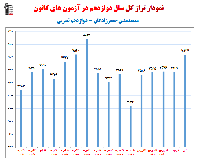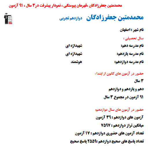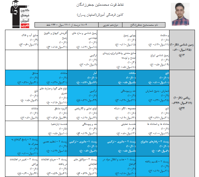 در ادامه میتوانید عملکرد درسی متین جعفرزادگان را در کانون مشاهده کنید.نمودار پیشرفت میانگین تراز در پایههای مختلف، نمودار تراز کل، عملکرد آزمونهای سال دوازدهم و شروع از تابستان و تراز آزمون های تابستان، کارنامههای مبحثی در نمودارها و تصاویر زیر قابل مشاهده است.