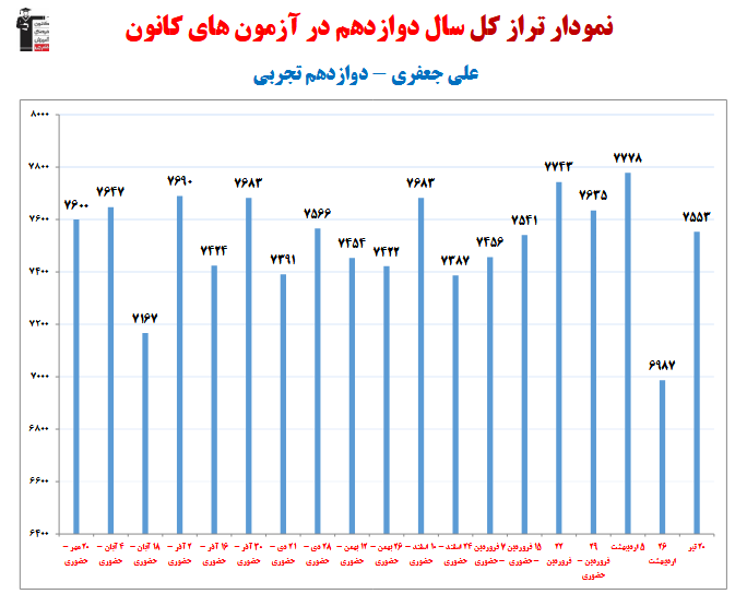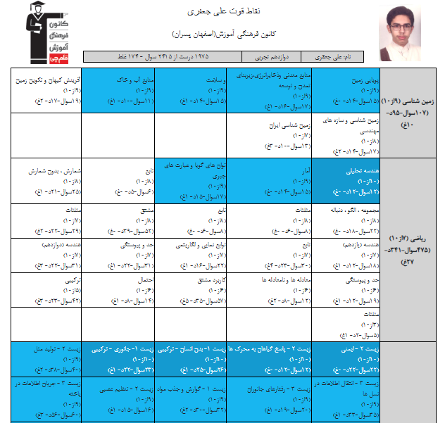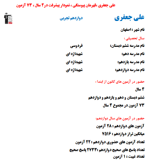 در ادامه میتوانید عملکرد درسی علی جعفری را در کانون مشاهده کنید.نمودار پیشرفت میانگین تراز در پایههای مختلف، نمودار تراز کل، عملکرد آزمونهای سال دوازدهم و شروع از تابستان و تراز آزمون های تابستان، کارنامههای مبحثی در نمودارها و تصاویر زیر قابل مشاهده است.
