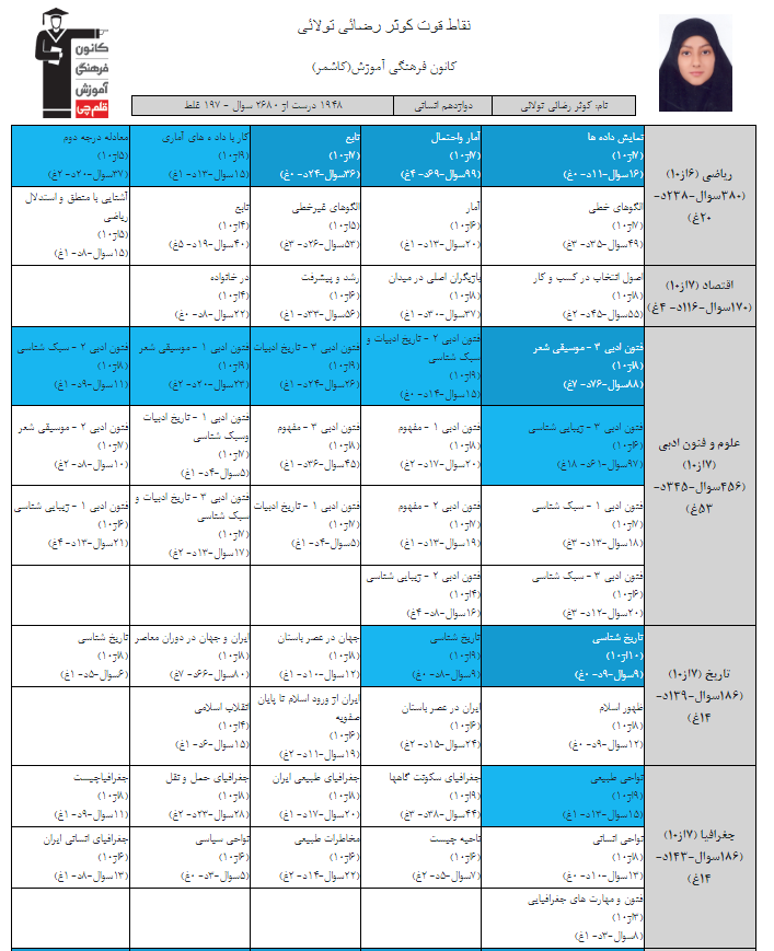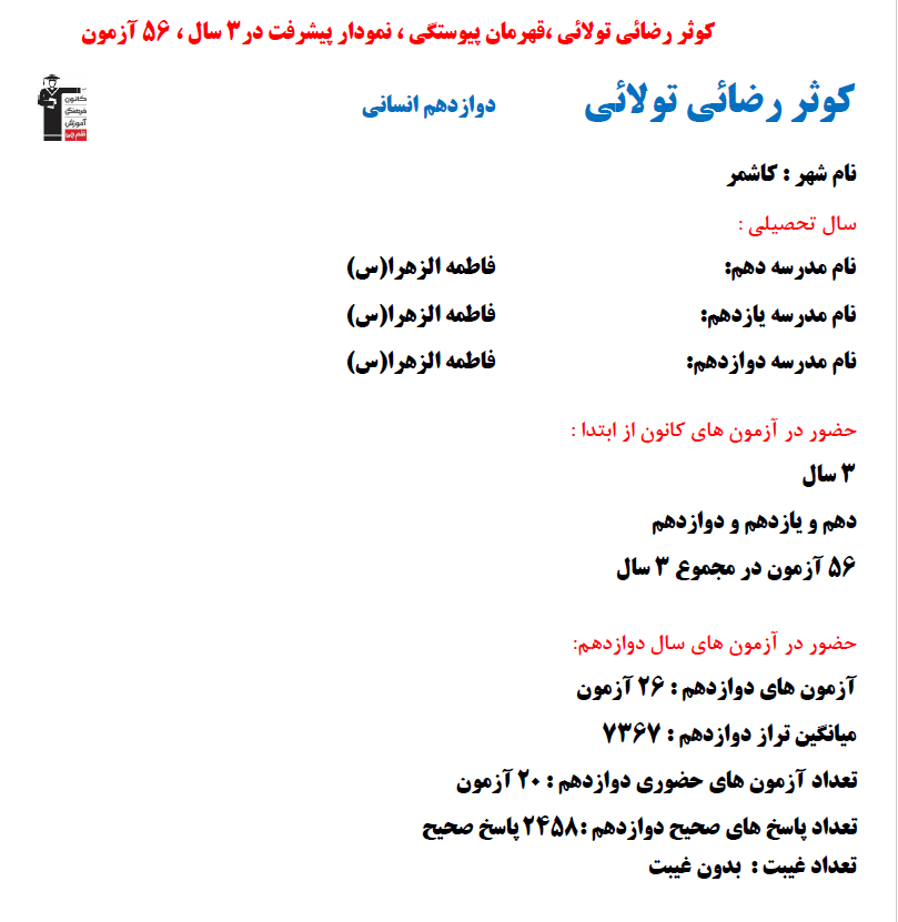 در ادامه میتوانید عملکرد درسی کوثر رضائی تولائی را در کانون مشاهده کنید.