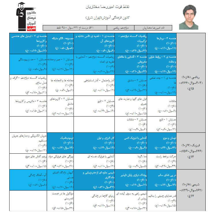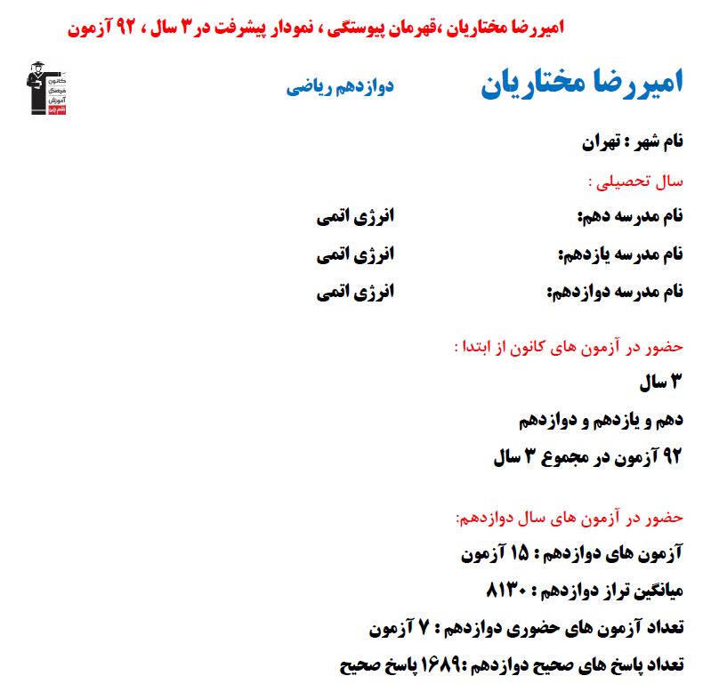 در ادامه میتوانید عملکرد درسی امیررضا مختاریان را در کانون مشاهده کنید.