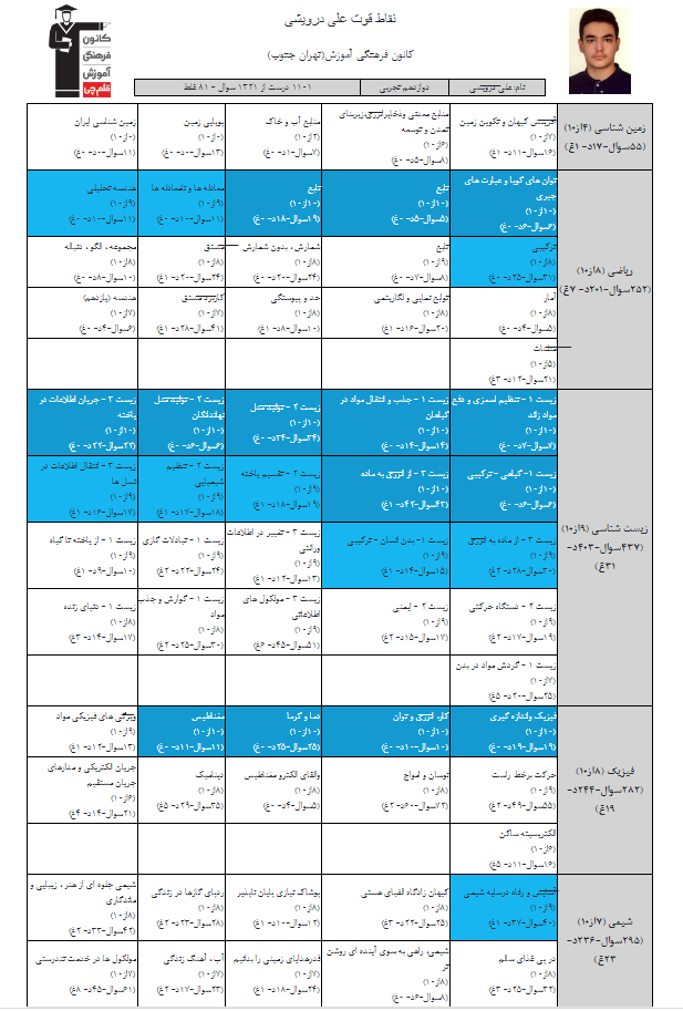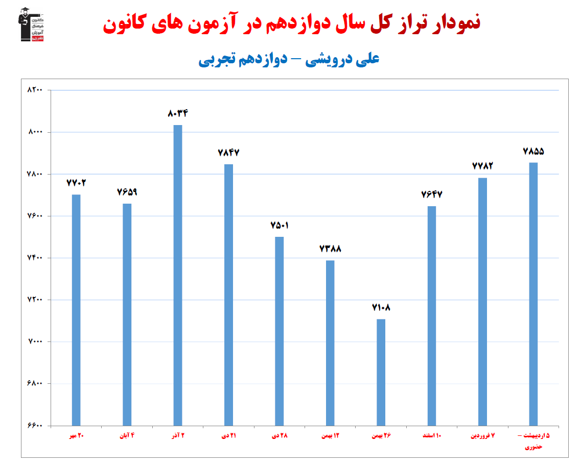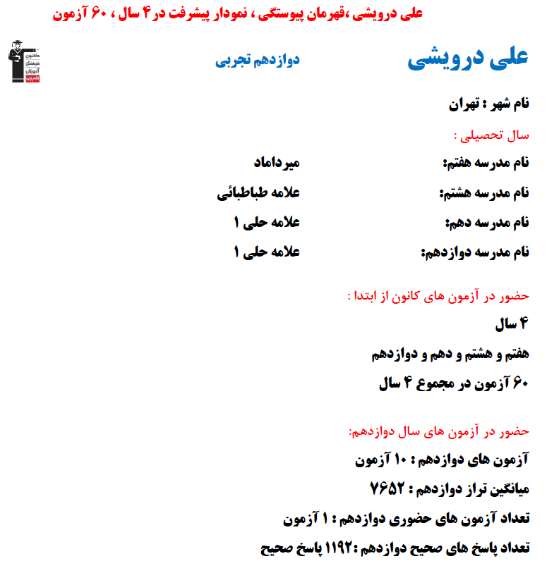 با برترهای دوازدهم تجربی ۱۴۰۴ آشنا شوید:در ادامه میتوانید عملکرد درسی علی درویشی را در کانون مشاهده کنید.نمودار پیشرفت میانگین تراز در پایههای مختلف، نمودار تراز کل، کارنامههای مبحثی در نمودارها و تصاویر زیر قابل مشاهده است.