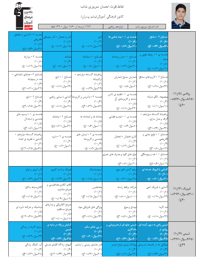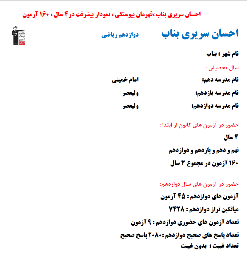 در ادامه میتوانید عملکرد درسی احسان سریری بناب را در کانون مشاهده کنید.