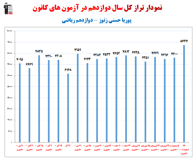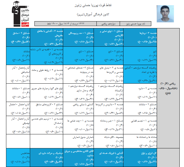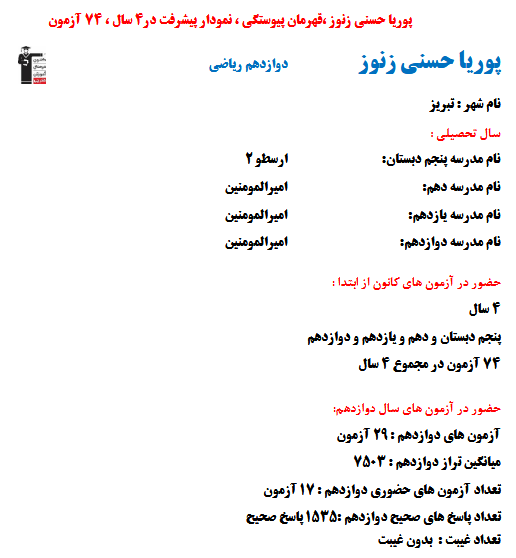 در ادامه میتوانید عملکرد درسی پوریا حسنی را در کانون مشاهده کنید. نمودار پیشرفت میانگین تراز در پایههای مختلف، نمودار تراز کل، عملکرد آزمونهای سال دوازدهم ، کارنامههای مبحثی در نمودارها و تصاویر زیر قابل مشاهده است.
