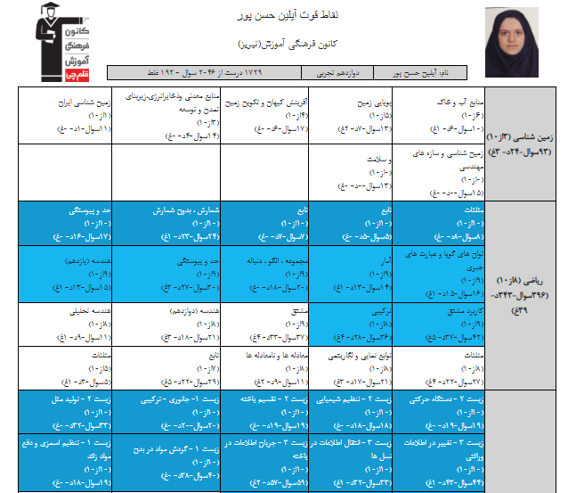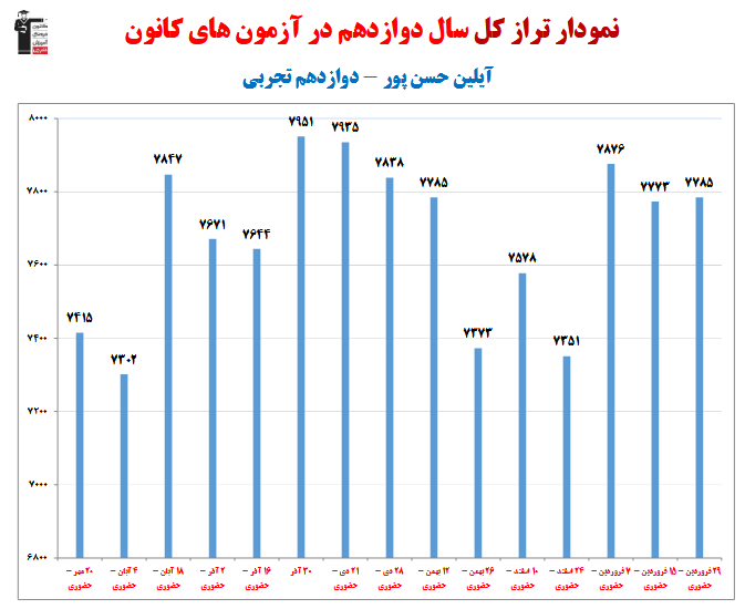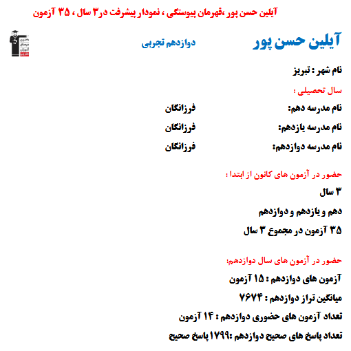 در ادامه میتوانید عملکرد درسی آیلین حسن پور را در کانون مشاهده کنید.نمودار پیشرفت میانگین تراز در پایههای مختلف، نمودار تراز کل، عملکرد آزمونهای سال دوازدهم ، کارنامههای مبحثی در نمودارها و تصاویر زیر قابل مشاهده است.