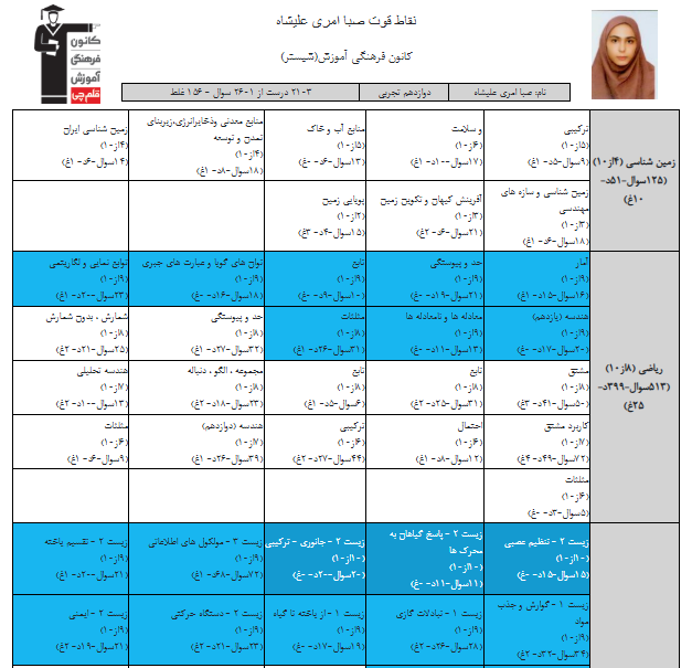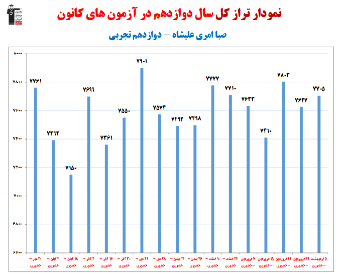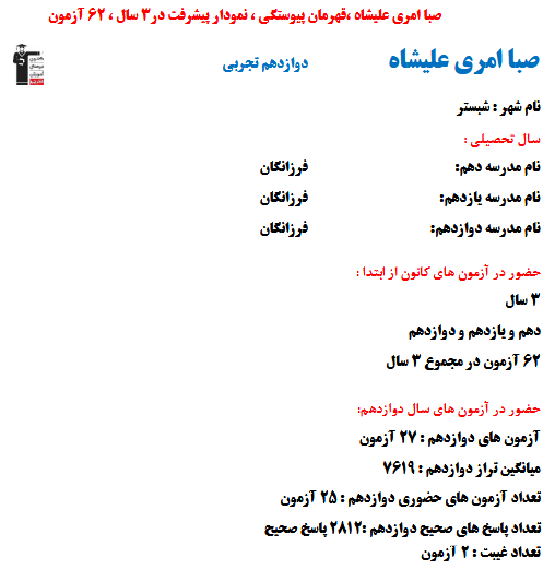 در ادامه میتوانید عملکرد درسی صبا علیشاه را در کانون مشاهده کنید.نمودار پیشرفت میانگین تراز در پایههای مختلف، نمودار تراز کل، عملکرد آزمونهای سال دوازدهم و شروع از تابستان و تراز آزمون های تابستان، کارنامههای مبحثی در نمودارها و تصاویر زیر قابل مشاهده است.