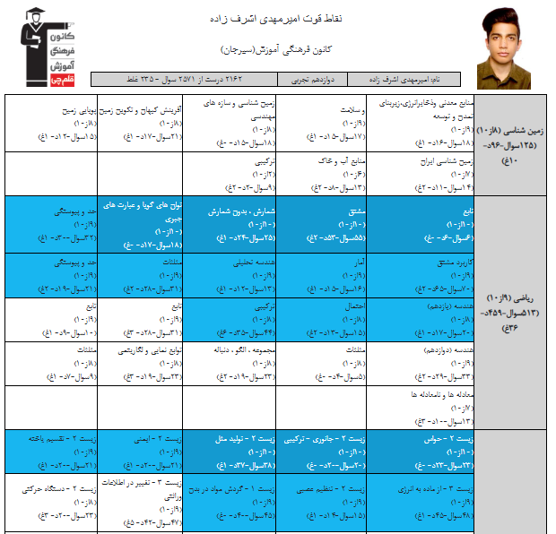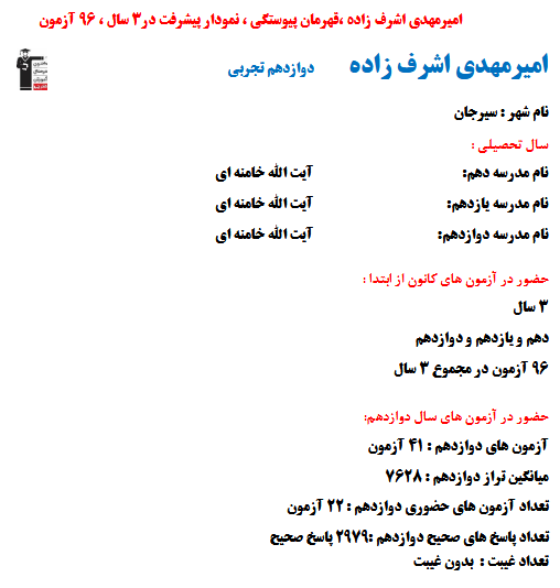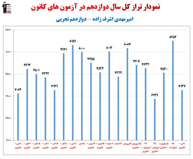 در ادامه میتوانید عملکرد درسی امیر مهدی اشرف زاده را در کانون مشاهده کنید.نمودار پیشرفت میانگین تراز در پایههای مختلف، نمودار تراز کل، عملکرد آزمونهای سال دوازدهم و شروع از تابستان و تراز آزمون های تابستان، کارنامههای مبحثی در نمودارها و تصاویر زیر قابل مشاهده است.