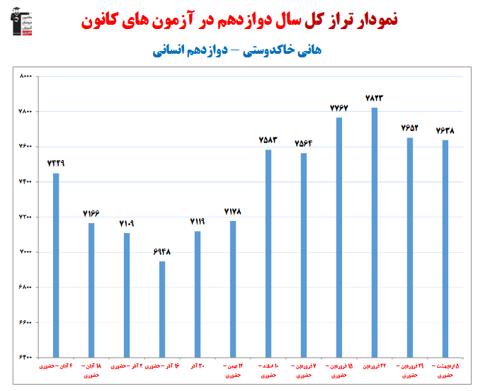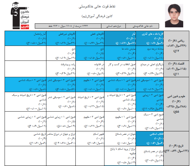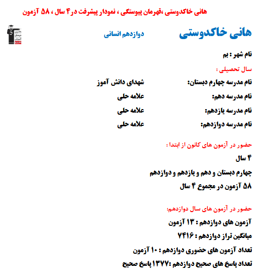 در ادامه میتوانید عملکرد درسی هانی خاکدوستی را در کانون مشاهده کنید.نمودار پیشرفت میانگین تراز در پایههای مختلف، نمودار تراز کل، عملکرد آزمونهای سال دوازدهم ، کارنامههای مبحثی در نمودارها و تصاویر زیر قابل مشاهده است.