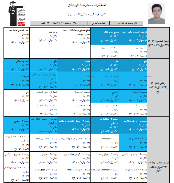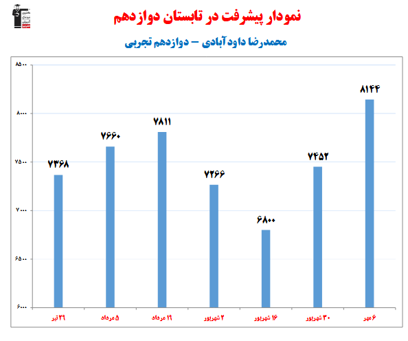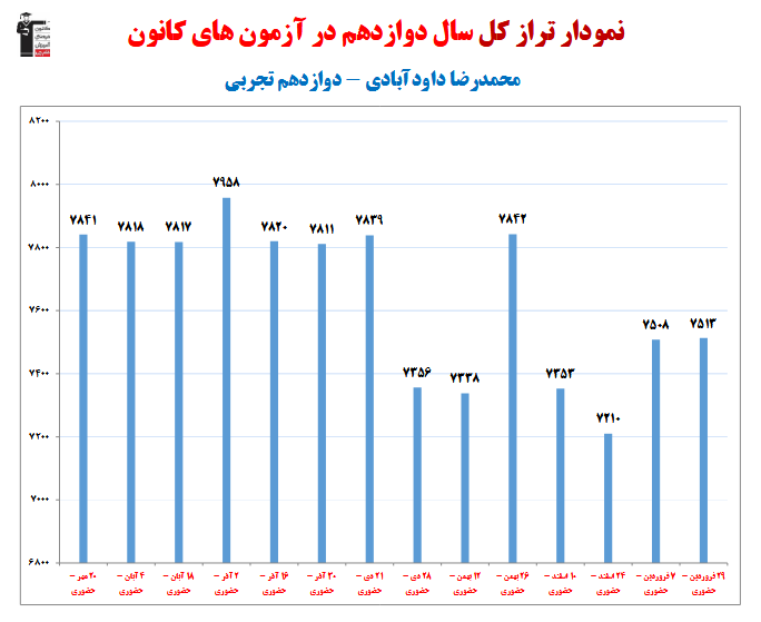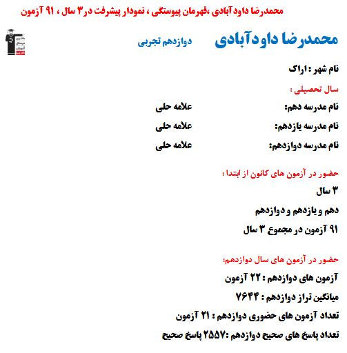 در ادامه میتوانید عملکرد درسی محمدرضا داود آبادی را در کانون مشاهده کنید.نمودار پیشرفت میانگین تراز در پایههای مختلف، نمودار تراز کل، عملکرد آزمونهای سال دوازدهم و شروع از تابستان و تراز آزمون های تابستان، کارنامههای مبحثی در نمودارها و تصاویر زیر قابل مشاهده است.