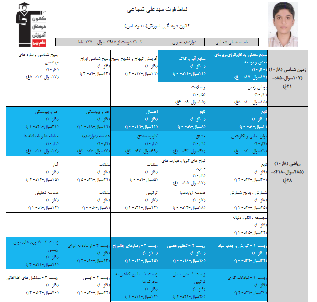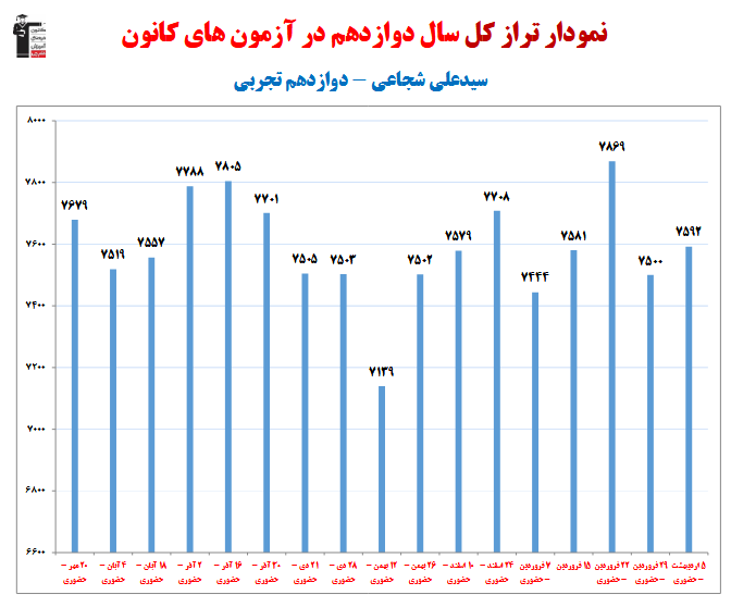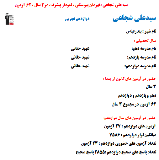در ادامه میتوانید عملکرد درسی سید علی شجاعی را در کانون مشاهده کنید.نمودار پیشرفت میانگین تراز در پایههای مختلف، نمودار تراز کل، عملکرد آزمونهای سال دوازدهم و شروع از تابستان و تراز آزمون های تابستان، کارنامههای مبحثی در نمودارها و تصاویر زیر قابل مشاهده است.