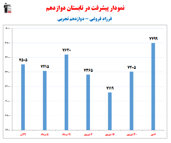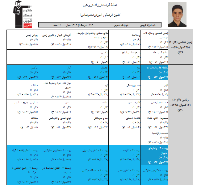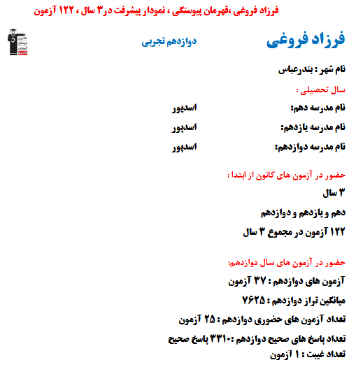 در ادامه میتوانید عملکرد درسی فرزاد فروغی را در کانون مشاهده کنید.نمودار پیشرفت میانگین تراز در پایههای مختلف، نمودار تراز کل، عملکرد آزمونهای سال دوازدهم و شروع از تابستان و تراز آزمون های تابستان، کارنامههای مبحثی در نمودارها و تصاویر زیر قابل مشاهده است.