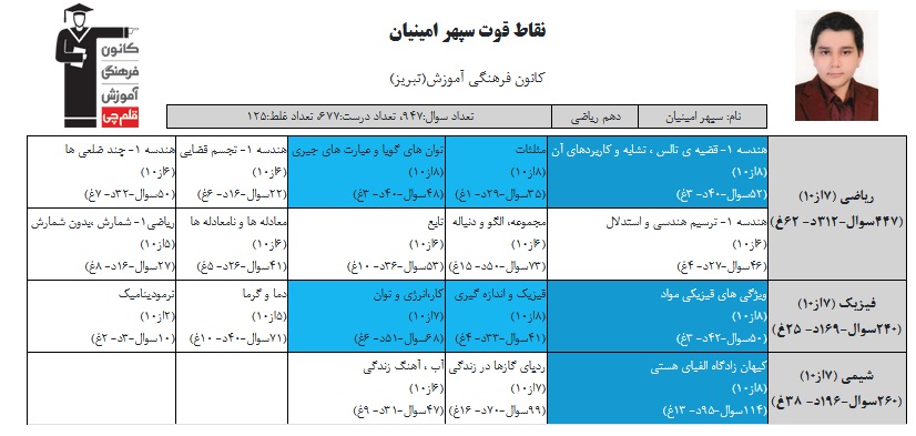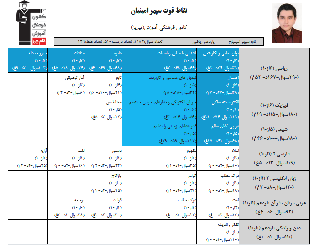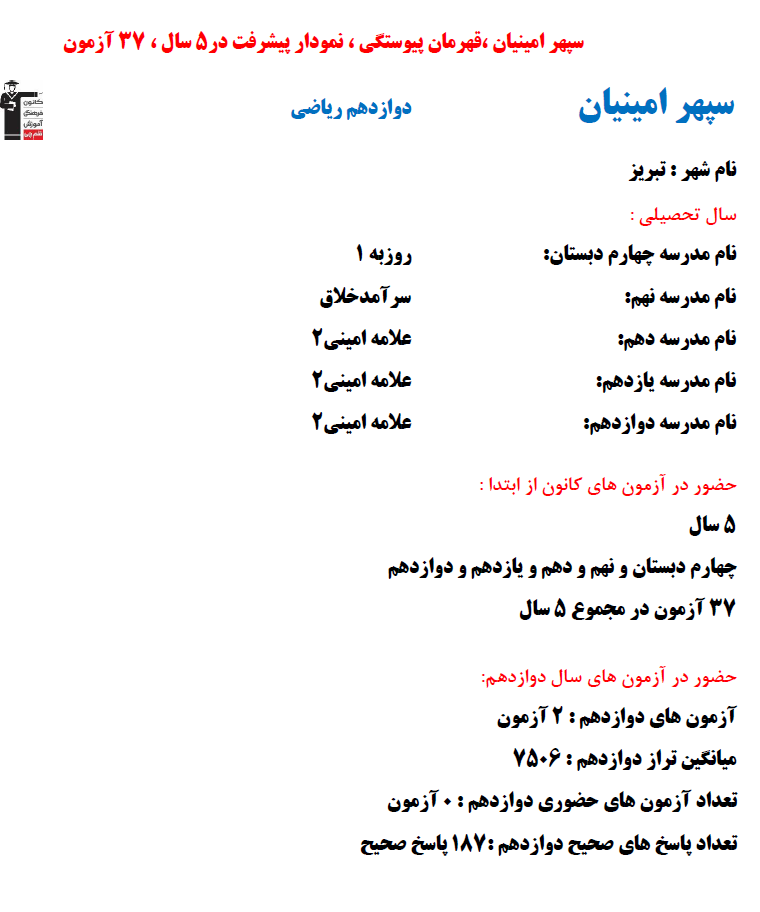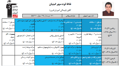 در ادامه میتوانید عملکرد درسی سپهر امینیان را در کانون مشاهده کنید.نمودار پیشرفت میانگین تراز در پایههای مختلف، نمودار تراز کل، عملکرد آزمونهای سال دوازدهم، کارنامههای مبحثی در نمودارها و تصاویر زیر قابل مشاهده است.