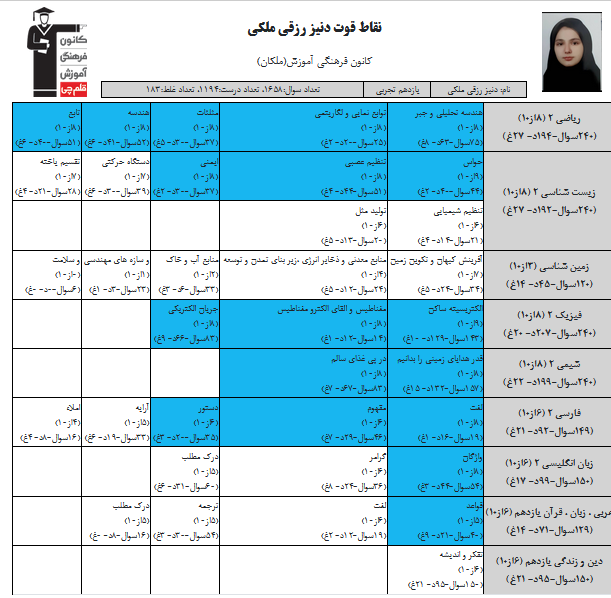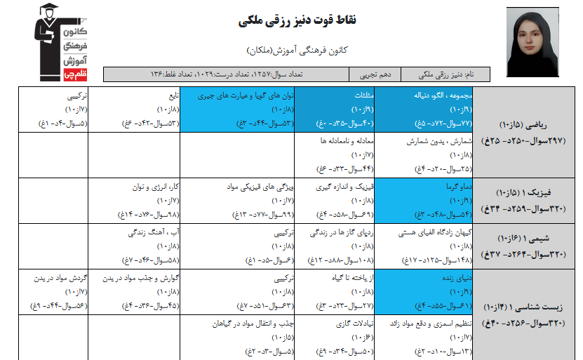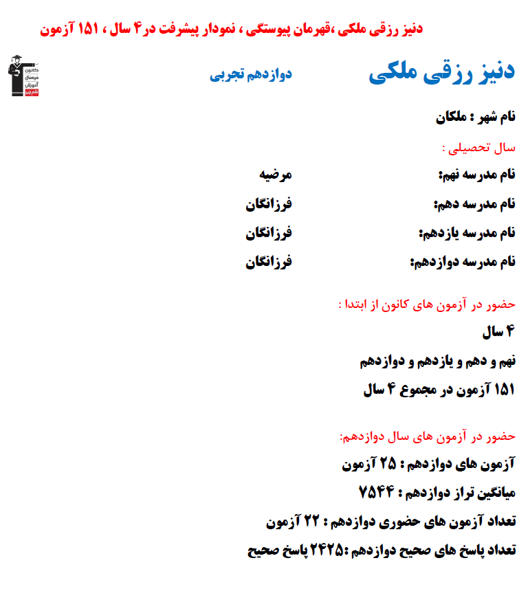 در ادامه میتوانید عملکرد درسی دنیز رزقی ملکی را در کانون مشاهده کنید. نمودار تراز کل، عملکرد آزمونهای سال دوازدهم و شروع از تابستان و تراز آزمون های تابستان، کارنامههای مبحثی در نمودارها و تصاویر زیر قابل مشاهده است.
