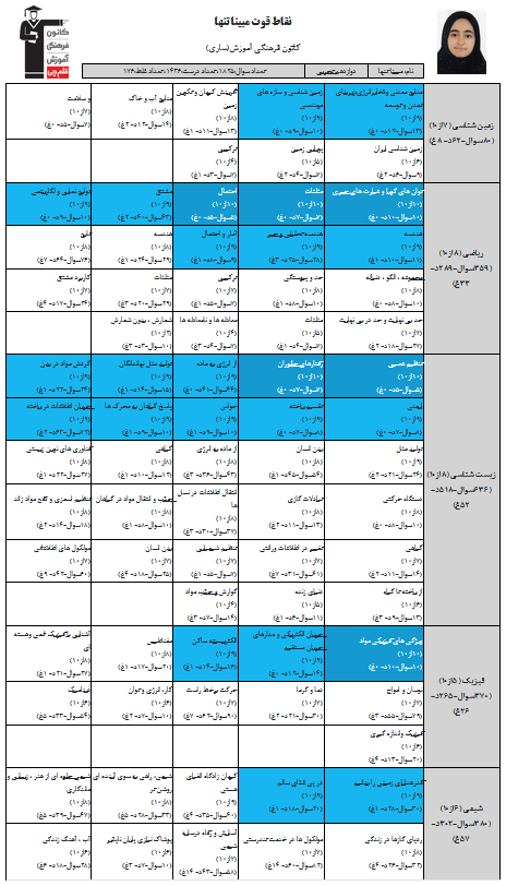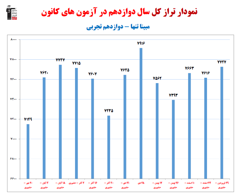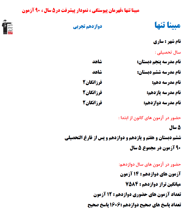 نمودار پیشرفت میانگین تراز در پایههای مختلف، نمودار تراز کل، عملکرد آزمونهای سال دوازدهم، کارنامههای مبحثی در نمودارها و تصاویر زیر قابل مشاهده است.