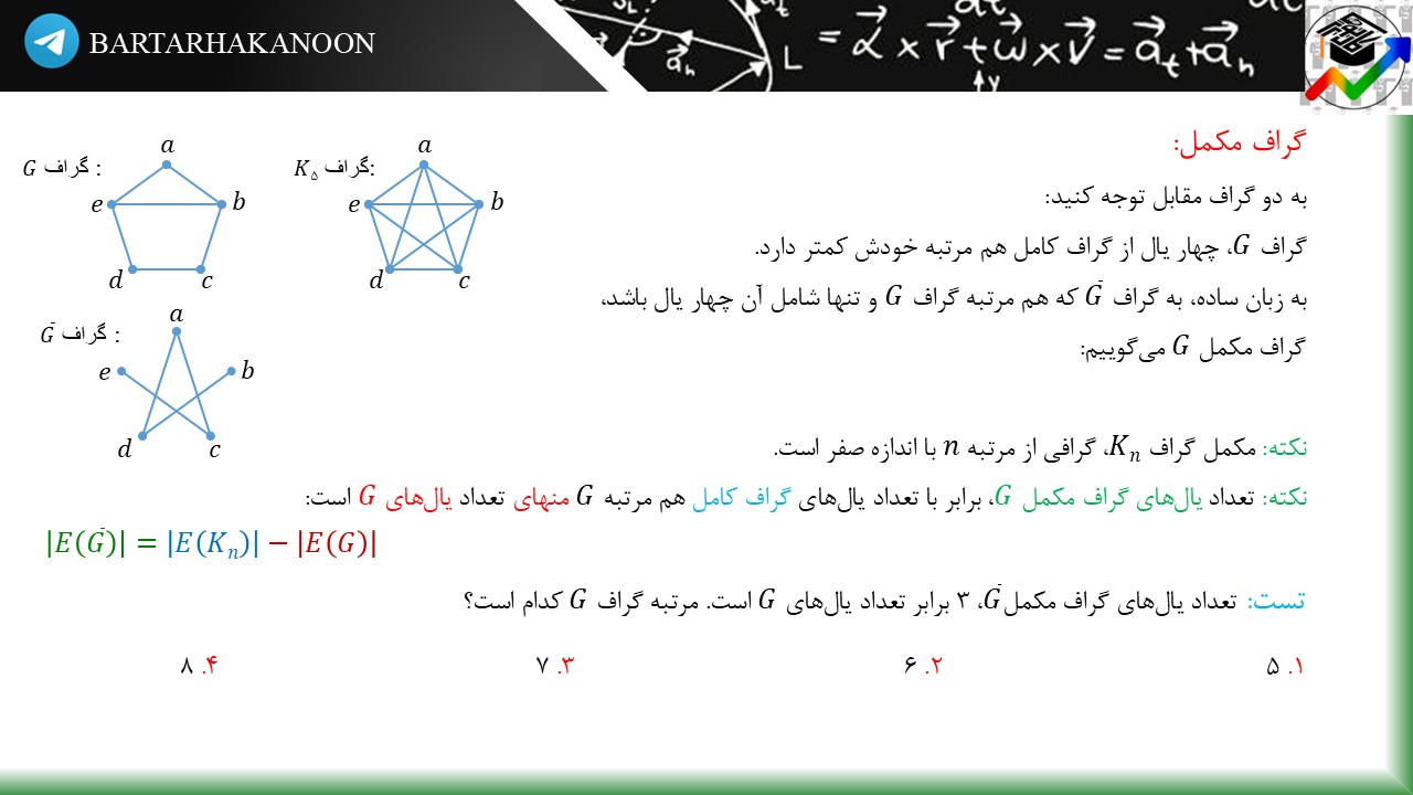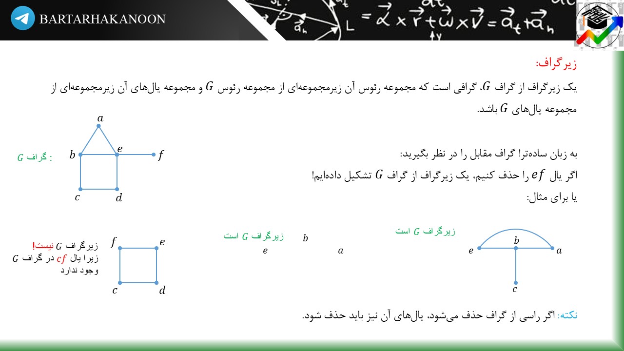 این درسنامه حاوی مطالبی در مورد گراف کامل، زیرگرافها، گراف مکمل، تحلیل درجه رئوس گراف، مجاورت و همسایگی، و بسیاری مطالب مفید دیگر است!