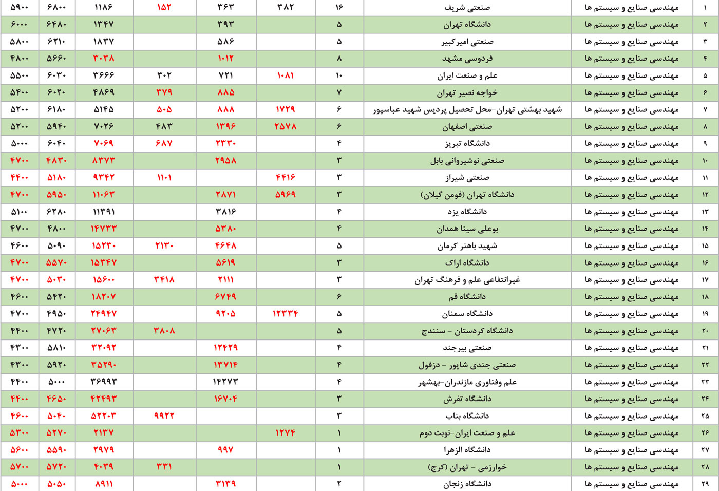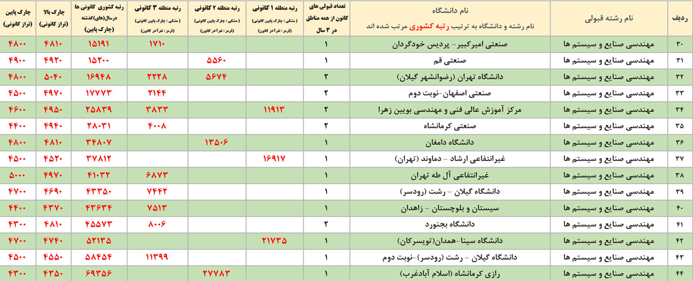 جدول انتخاب رشته مهندسی صنایع