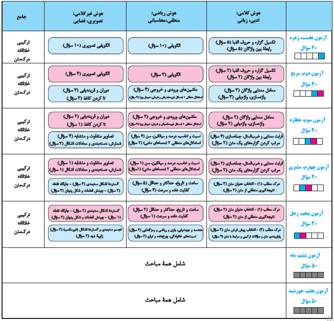 در این برنامه جدید،در 5 آزمون به صورت مبحثی پیشروی می کنند و در 2 آزمون آخر به صورت جامع از شما سؤال پرسیده میشود.