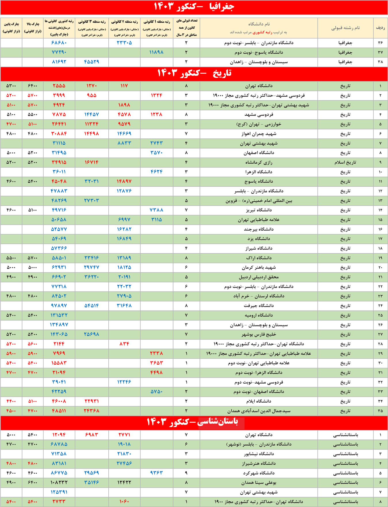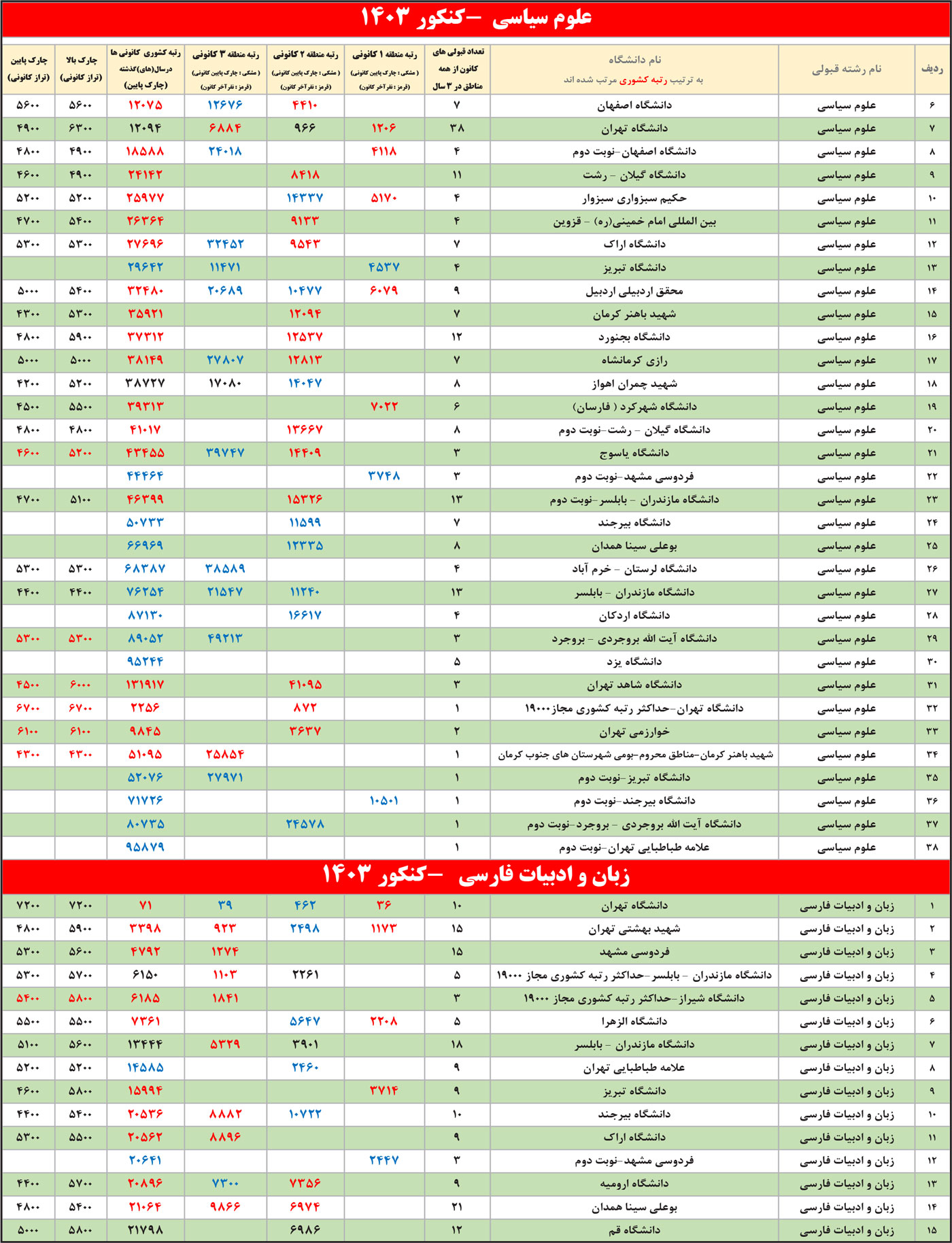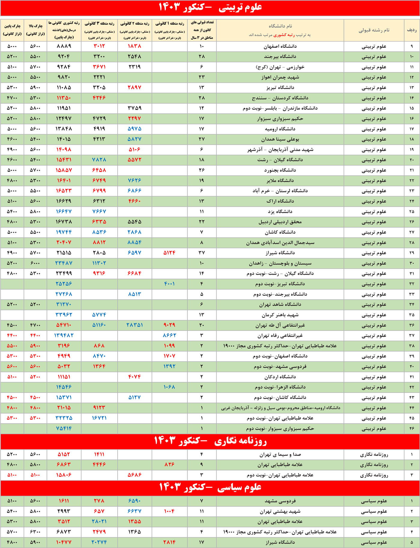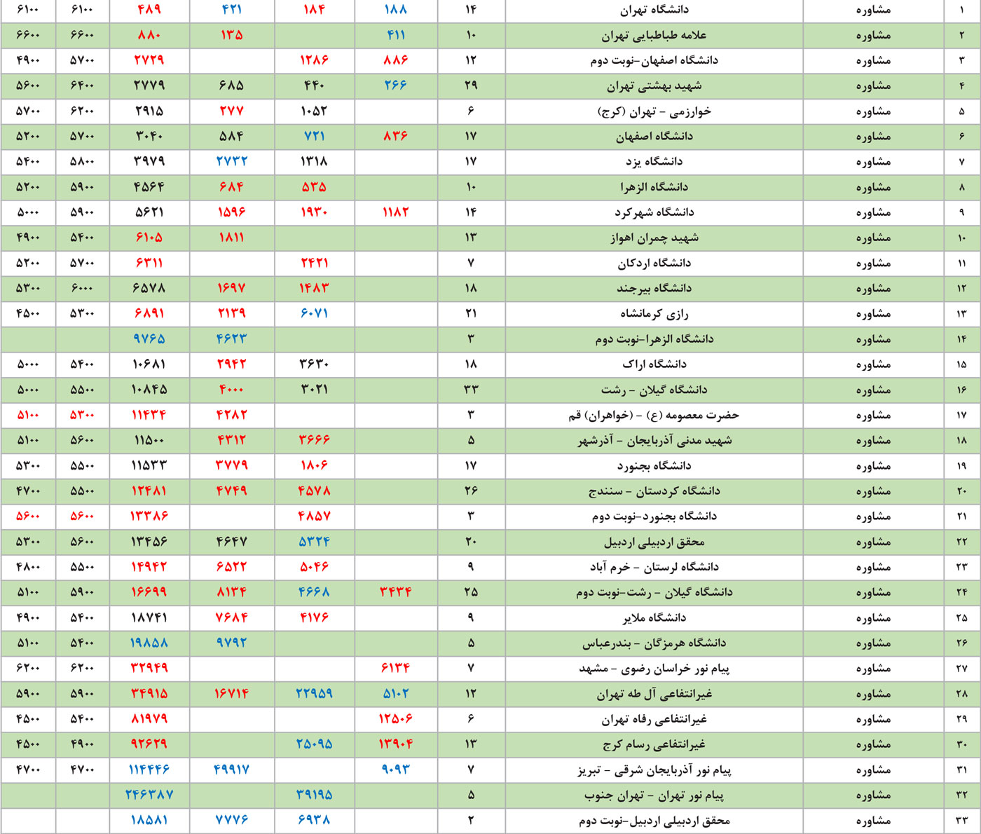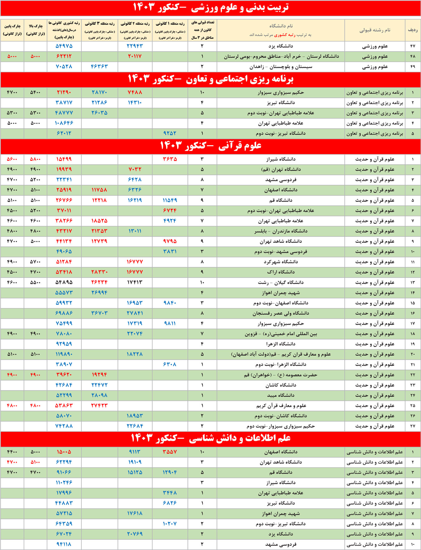 همچنین جدول سایر رشته ها به تدریج منتشر مشود.