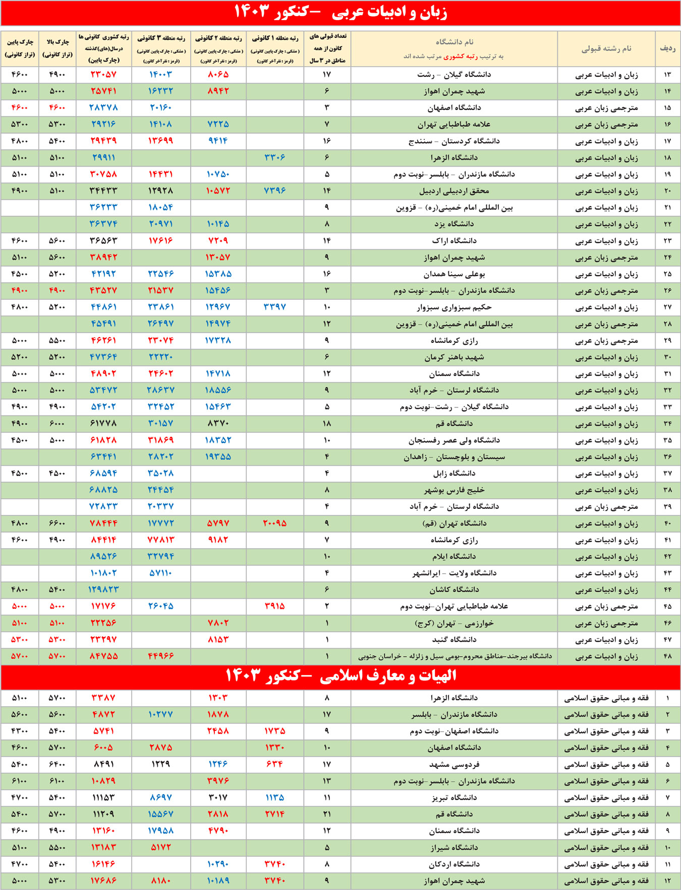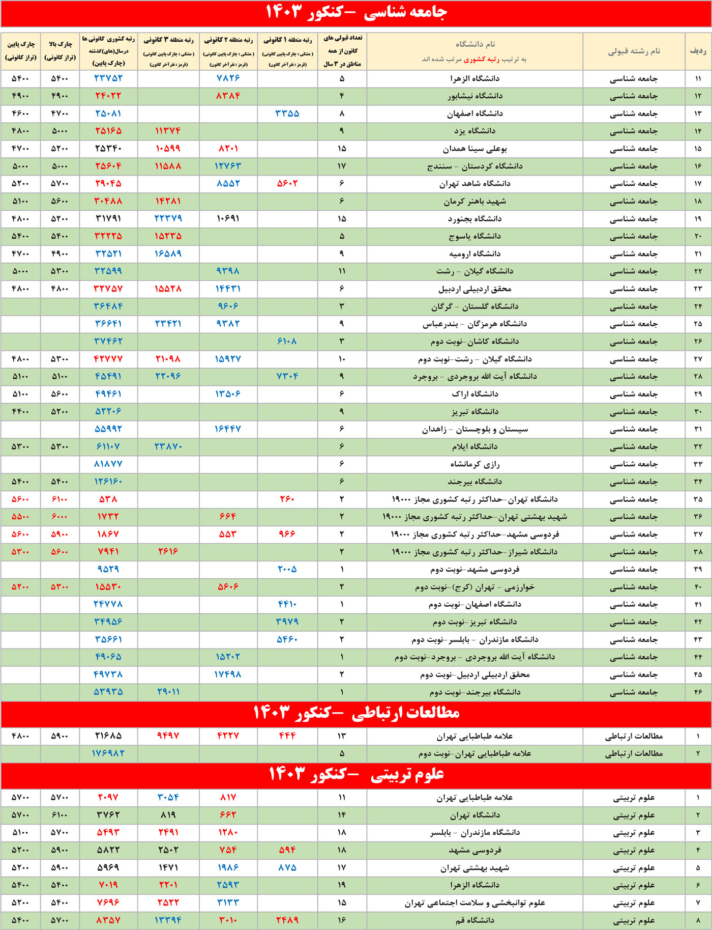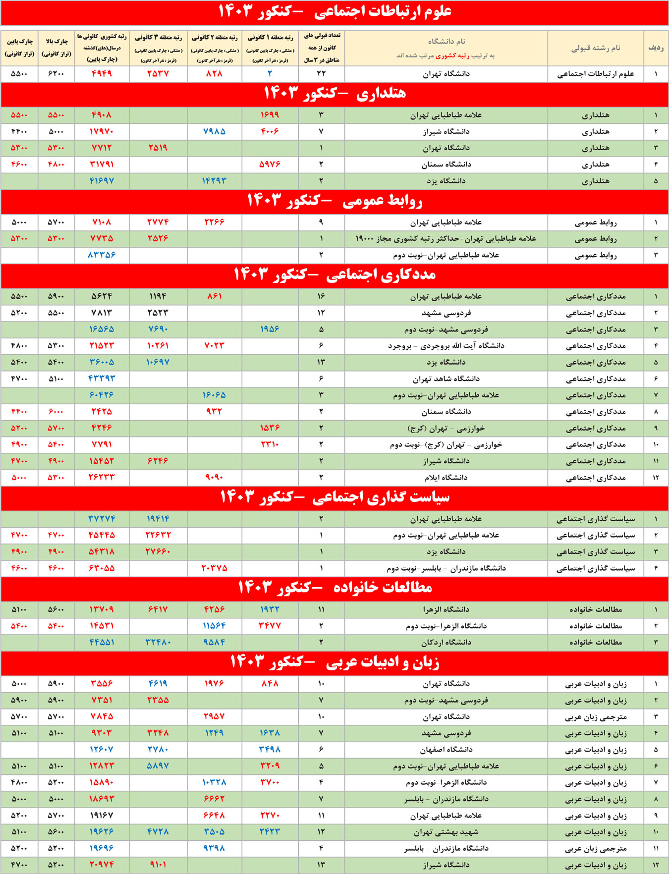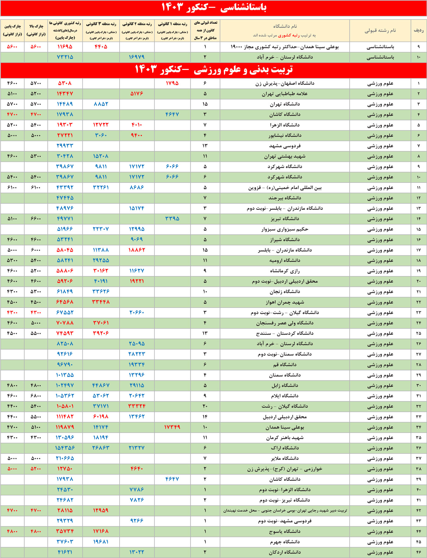همچنین جدول سایر رشته ها به تدریج منتشر مشود.