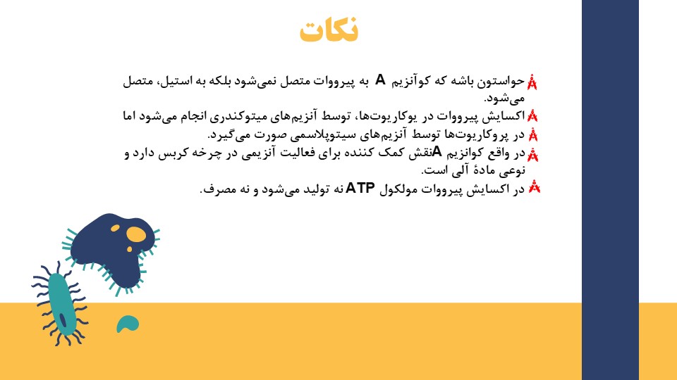 این مولکول با انتقال فعال وارد راکیزه میشود و در آنجا اکسایش مییابد. پییرووات با از دست دادن یک کربن دی اکسید به استیل تبدیل میشود و با اتصال به کوانزیم