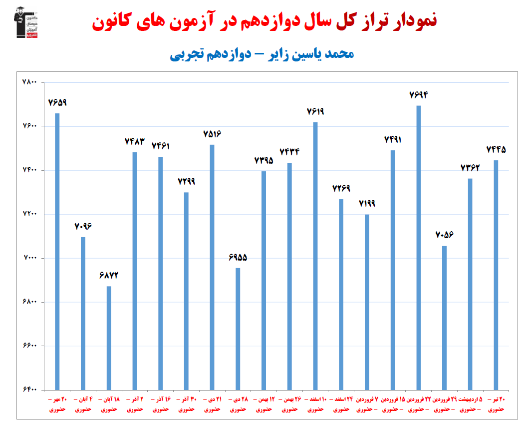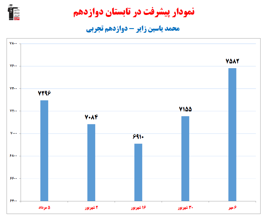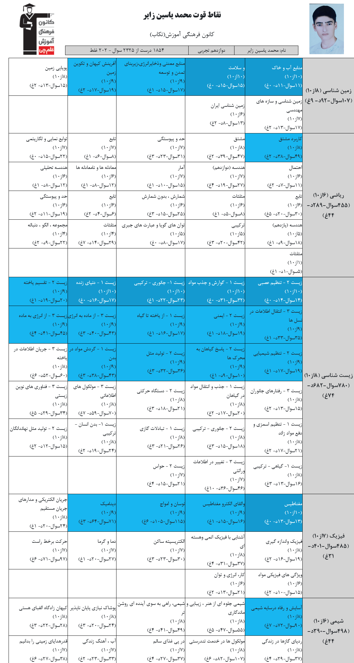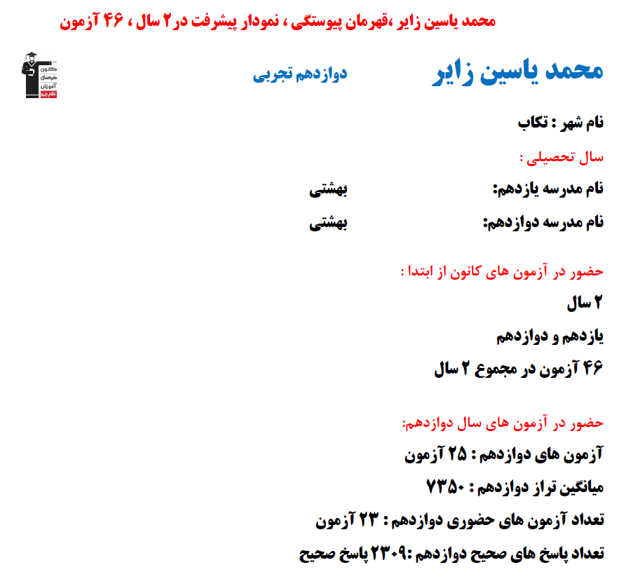 در ادامه میتوانید عملکرد درسی محمد ياسين زاير را در کانون مشاهده کنید.نمودار پیشرفت میانگین تراز در پایههای مختلف، نمودار تراز کل، عملکرد آزمونهای سال دوازدهم و شروع از تابستان و تراز آزمون های تابستان، کارنامههای مبحثی در نمودارها و تصاویر زیر قابل مشاهده است.