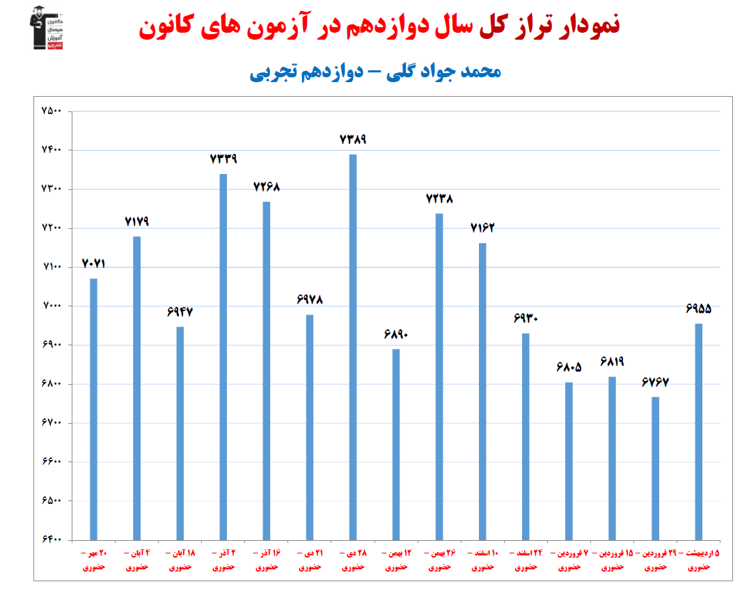 در ادامه میتوانید عملکرد درسی محمد جواد گلي را در کانون مشاهده کنید.نمودار پیشرفت میانگین تراز در پایههای مختلف، نمودار تراز کل، عملکرد آزمونهای سال دوازدهم و کارنامههای مبحثی در نمودارها و تصاویر زیر قابل مشاهده است.